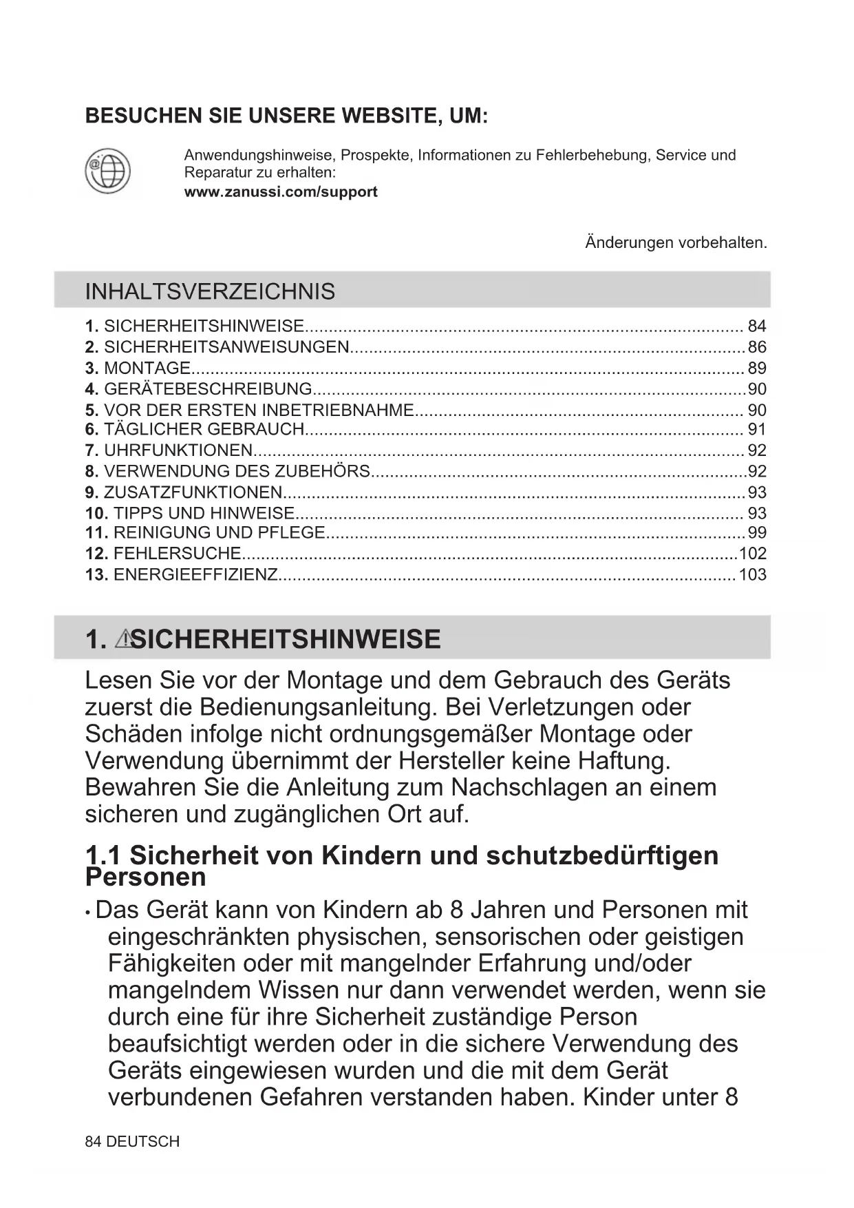 Der Backofen verfügt über Funktionen, mit deren Hilfe Sie beim täglichen Kochen Energie sparen können. Achten Sie darauf, dass die Backofentür während des Ofenbetriebs geschlossen ist. Die Backofentür darf während des Garvorgangs nicht zu oft geöffnet werden. Halten Sie die Türdichtung sauber und stellen Sie sicher, dass sie sich fest in der richtigen Position befindet. Verwenden Sie Kochgeschirr aus Metall, um mehr Energie zu sparen. Heizen Sie, wenn möglich, den Backofen nicht vor. Halten Sie die Unterbrechungen beim Backen so kurz wie möglich, wenn Sie mehrere Speisen gleichzeitig zubereiten. Garen mit Heißluft Nutzen Sie, wenn möglich, die Garfunktionen mit Heißluft, um Energie zu sparen. Restwärme Beträgt die Garzeit mehr als 30 Minuten, reduzieren Sie die Ofentemperatur 3 - 10 Min. vor Ablauf des Garvorgangs. Durch die Restwärme des Backofens werden die Speisen weiter gegart. Nutzen Sie die Restwärme, um andere Speisen aufzuwärmen. Warmhalten von Speisen Wählen Sie die niedrigste Temperatureinstellung, wenn Sie die Restwärme zum Warmhalten von Speisen nutzen möchten. Feuchte Umluft Diese Funktion ist entwickelt worden, um während des Garvorgangs Energie zu sparen. DEUTSCH 10314. UMWELTTIPPS Recyceln Sie Materialien mit dem Symbol . Entsorgen Sie die Verpackung in den entsprechenden Recyclingbehältern. Recyceln Sie zum Umwelt- und Gesundheitsschutz elektrische und elektronische Geräte. Entsorgen Sie Geräte mit diesem Symbol nicht mit dem Hausmüll. Bringen Sie das Gerät zu Ihrer örtlichen Sammelstelle oder wenden Sie sich an Ihr Gemeindeamt. 104 DEUTSCHGÅ INN PÅ NETTSIDEN VÅR FOR Å: Få råd om bruk, brosjyrer, hjelp til feilsøking, og informasjon om service ogreparasjon:www.zanussi.com/supportMed forbehold om endringer. INNHOLD