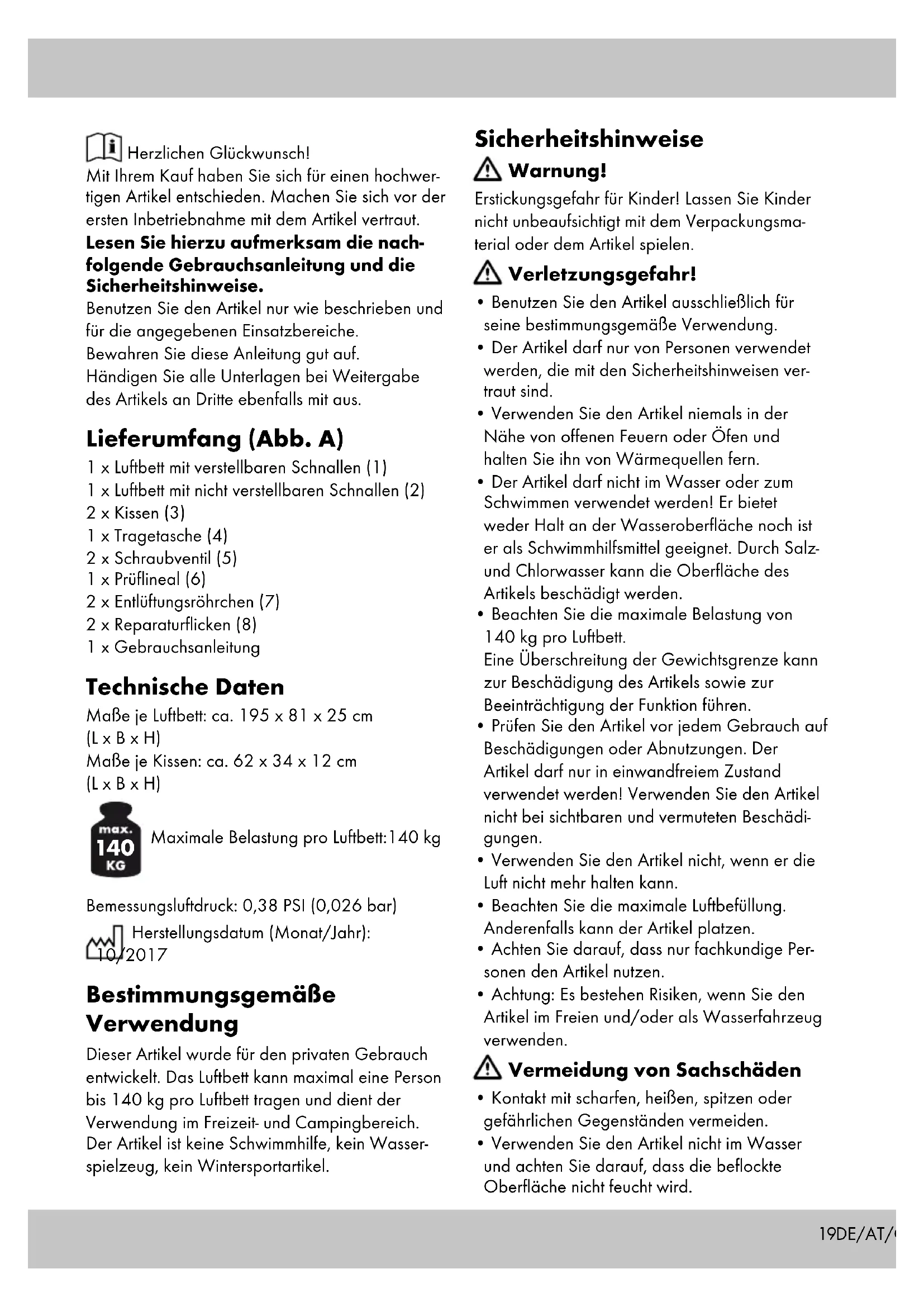Dieser Artikel wurde für den privaten Gebrauch entwickelt. Das Luftbett kann maximal eine Person bis 140kg pro Luftbett tragen und dient der Verwendung im Freizeit- und Campingbereich.