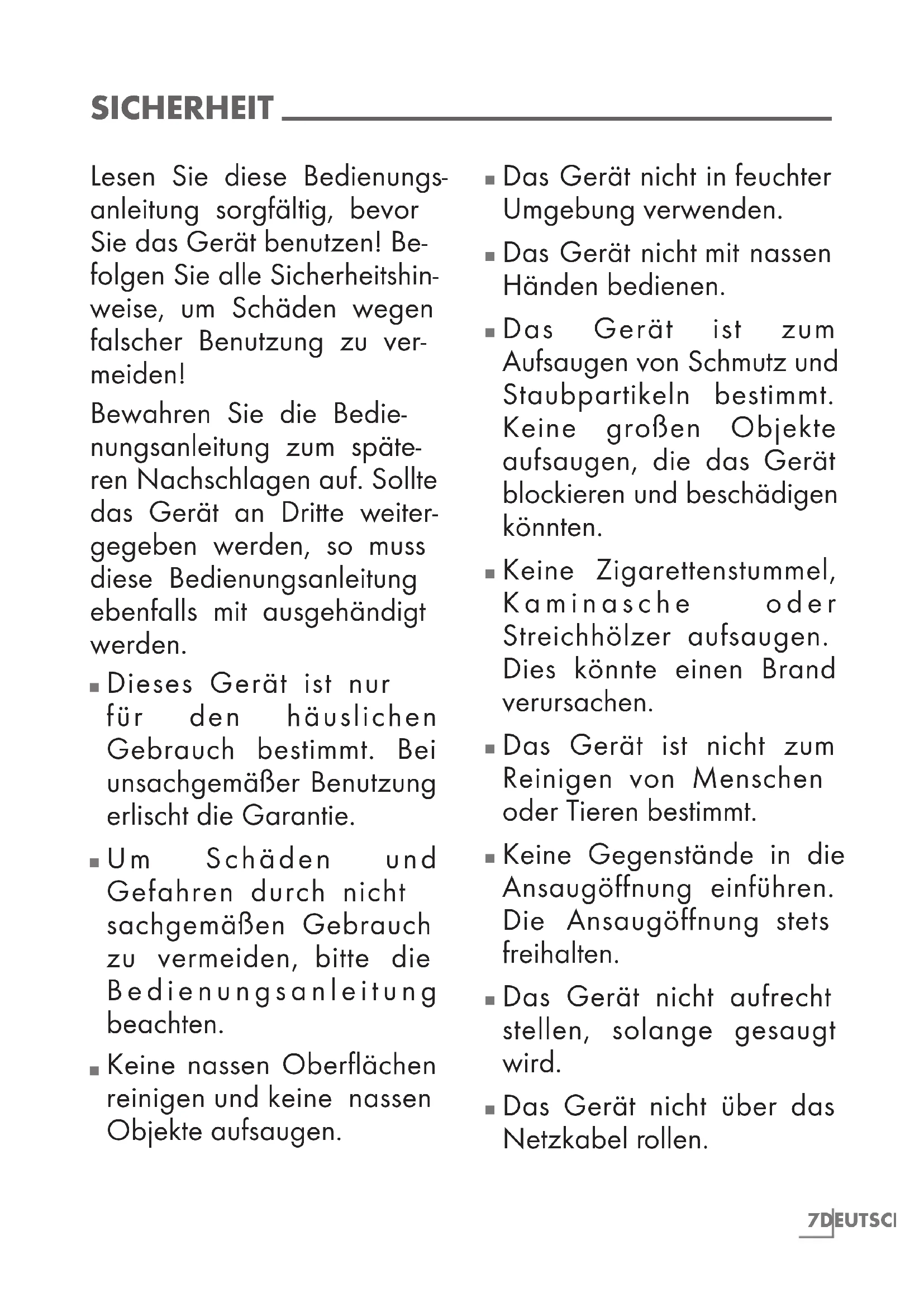 Das Gerät nicht über das Netzkabel rollen.8 DEUTSCH