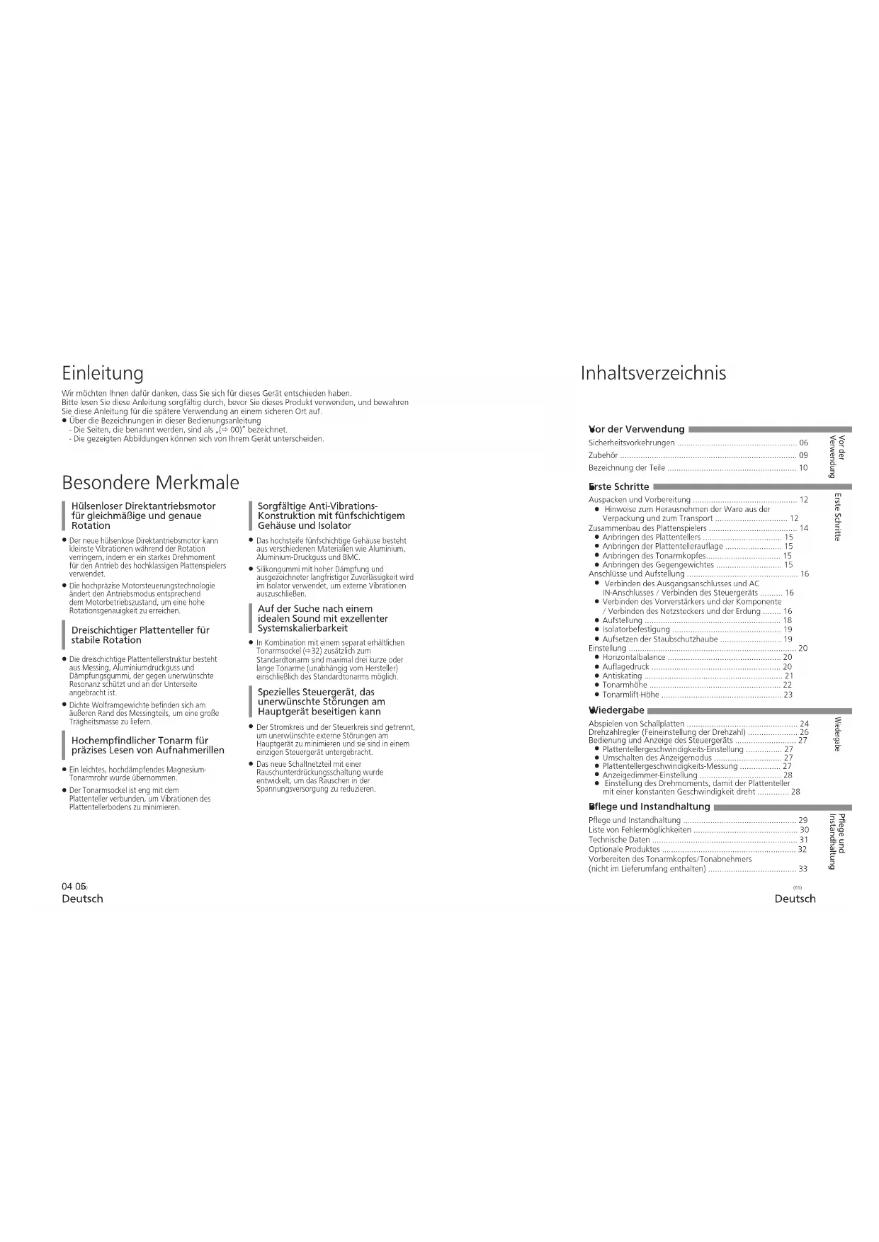 - Vorbereiten des Tonarmkopfes/Tonabnehmers (nicht im Lieferumfang enthalten) Einleitung Wir möchten Ihnen dafür danken, dass Sie sich für dieses Gerät entschieden haben. Bitte lesen Sie diese Anleitung sorgfältig durch, bevor Sie dieses Produkt verwenden, und bewahren Sie diese Anleitung für die spätere Verwendung an einem sicheren Ort auf. p. 33