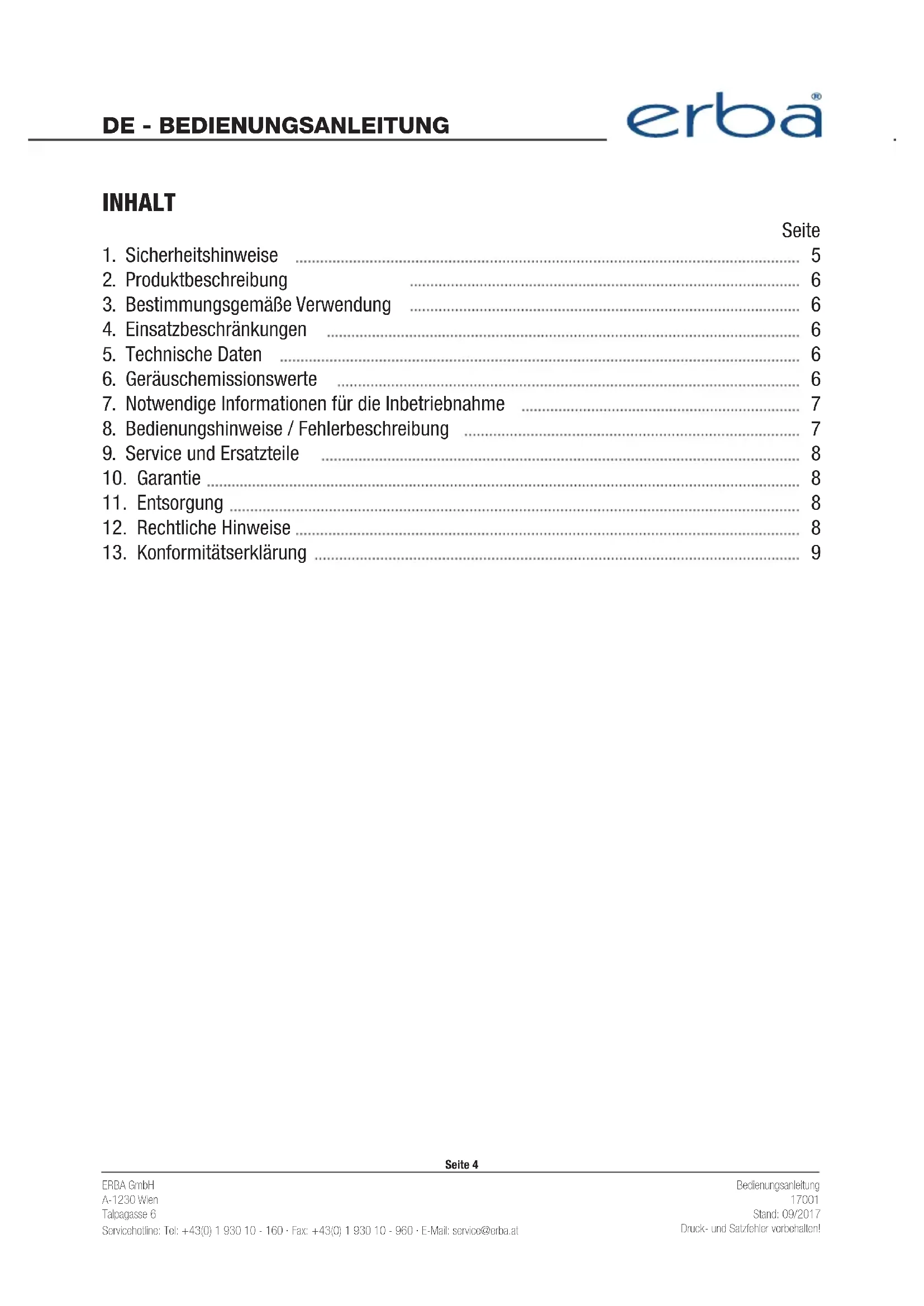 Finden Sie kostenlos die Bedienungsanleitung des Geräts 17001 Erba als PDF.