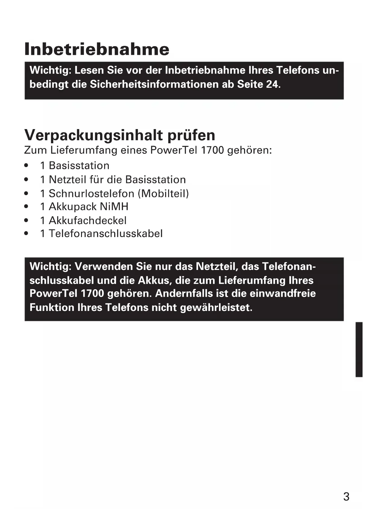 Wichtig: Benutzen Sie unbedingt nur das mit dem PowerTel 1700 gelieferte Netzteil.
