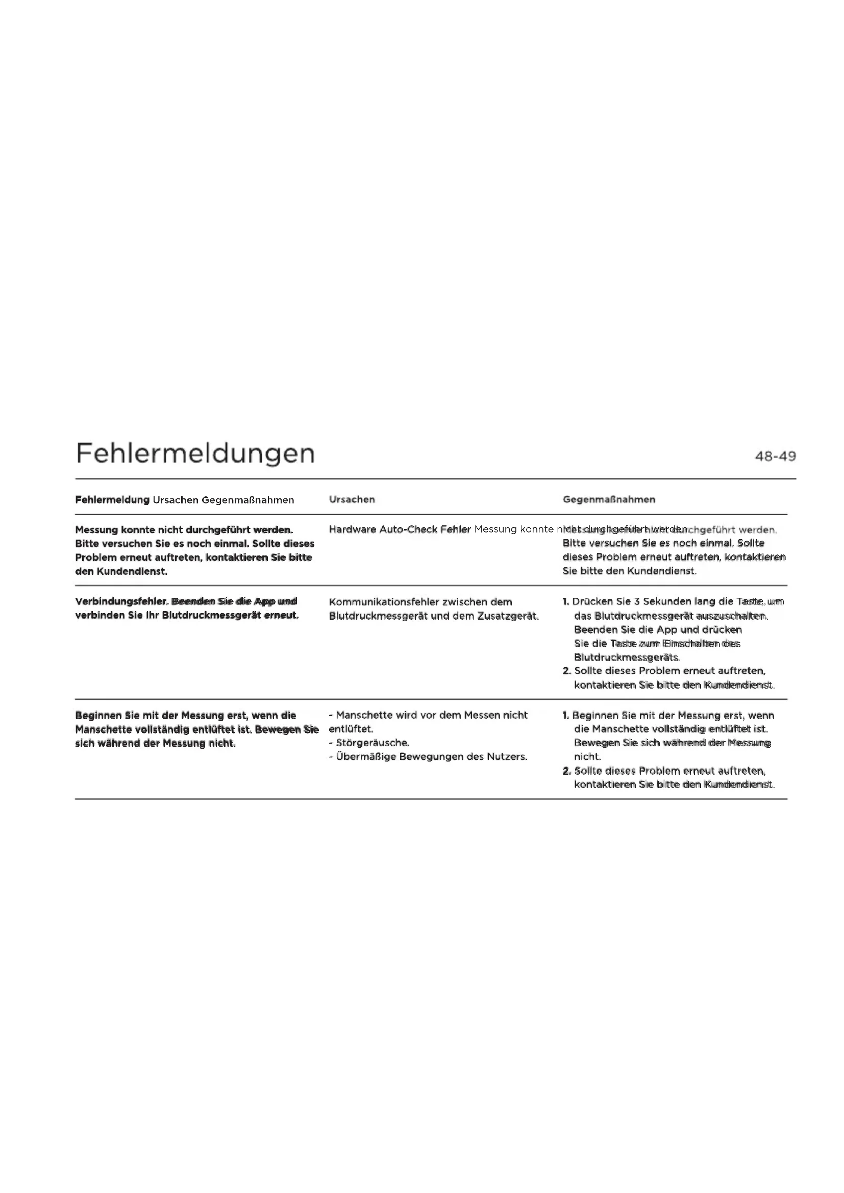 kontaktieren Sie bitte den Kundendienst. Beginnen Sie mit der Messung erst, wenn die Manschette vollständig entlüftet ist. Bewegen Sie sich während der Messung nicht. - Manschette wird vor dem Messen nicht entlüftet. - Störgeräusche. - Übermäßige Bewegungen des Nutzers.