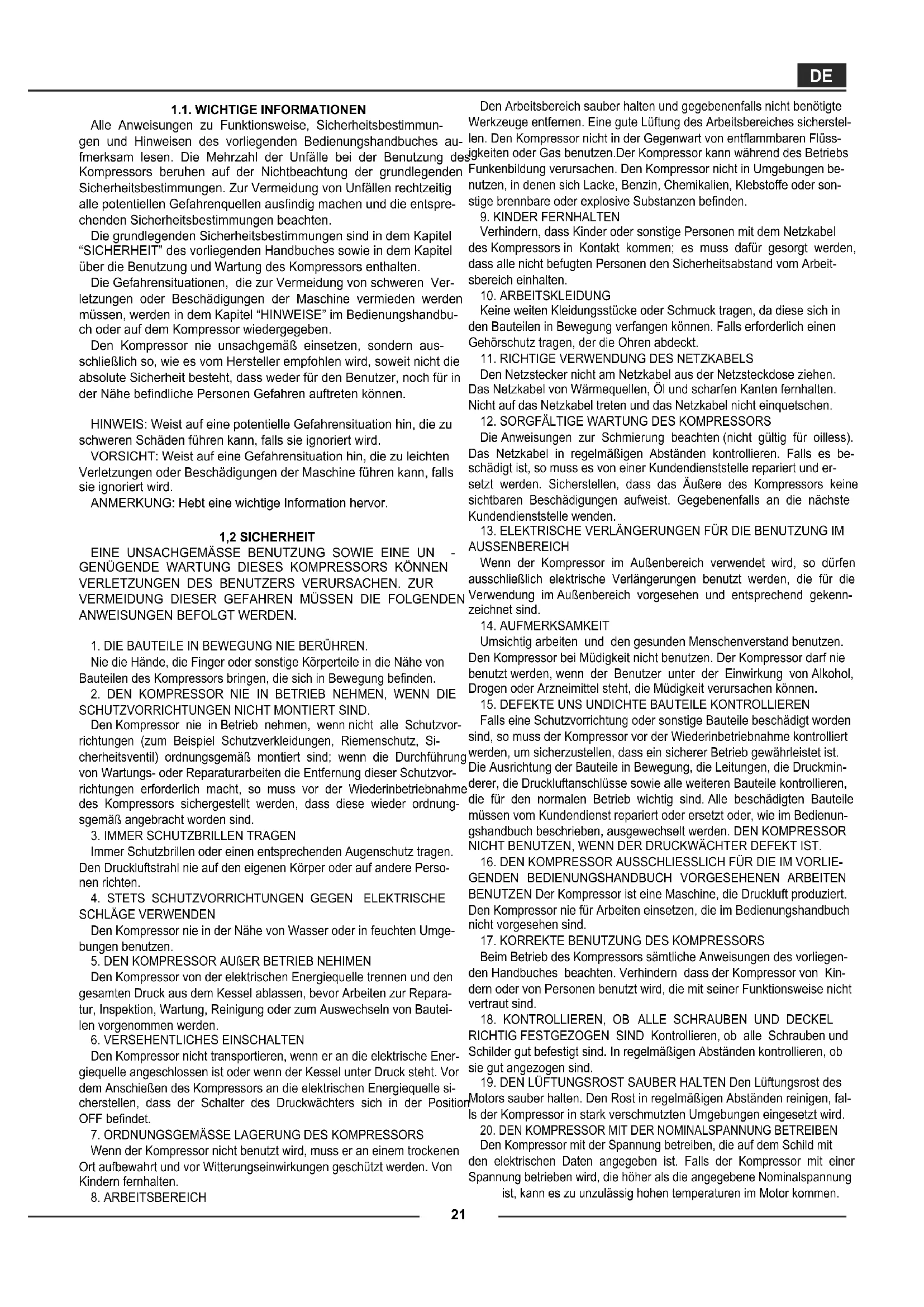 presseur. Ne pas essayer de réparer le tuyau lorsqu’il est défectueux.21 1.1. WICHTIGE INFORMATIONEN Alle Anweisungen zu Funktionsweise, Sicherheitsbestimmun- gen und Hinweisen des vorliegenden Bedienungshandbuches au- fmerksam lesen. Die Mehrzahl der Unfälle bei der Benutzung des Kompressors beruhen auf der Nichtbeachtung der grundlegenden Sicherheitsbestimmungen. Zur Vermeidung von Unfällen rechtzeitig
