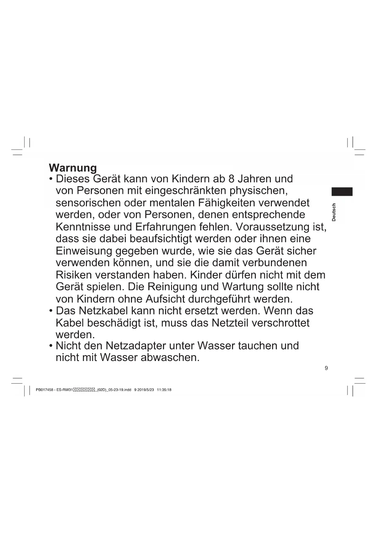 - Das Netzkabel kann nicht ersetzt werden. Wenn das Kabel beschädigt ist, muss das Netzteil verschrottet werden. PB017458 - ES-RW31_(02D)_05-23-19.indd 9 2019/5/23 11:35:18 Nicht den Netzadapter unter Wasser tauchen und nicht mit Wasser abwaschen.