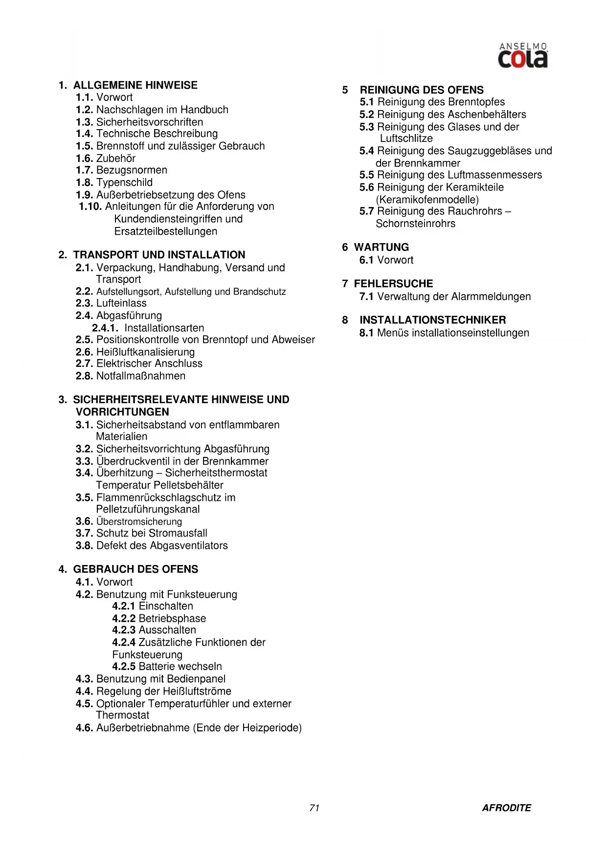 Für jeder Art von Wartung und für die Reinigung am Ende der Heizperiode empfeht die Firma COLA, sich an den Vertragskundendienst zu wenden, der den Ofen nicht nur reinigt sondern auch den Verschleibzustand der inneren Bauteile des Ofens kontrolliert.