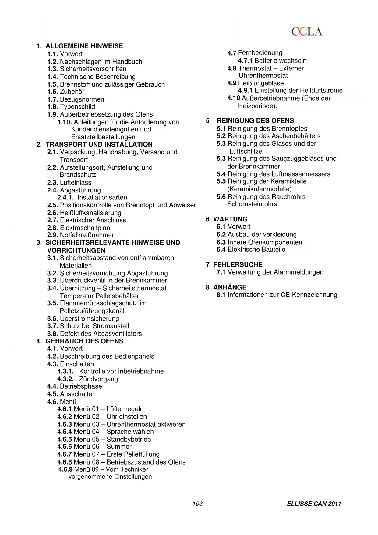 Für jede Art von Wartung und für die Reinigung am Ende der Heizperiode empfiehlt die Firma COLA, sich an den Vertragskundendienst zu wenden, der den Ofen nicht nur reinigt sondern auch den Verschleißzustand der inneren Bauteile des Ofens kontrolliert.