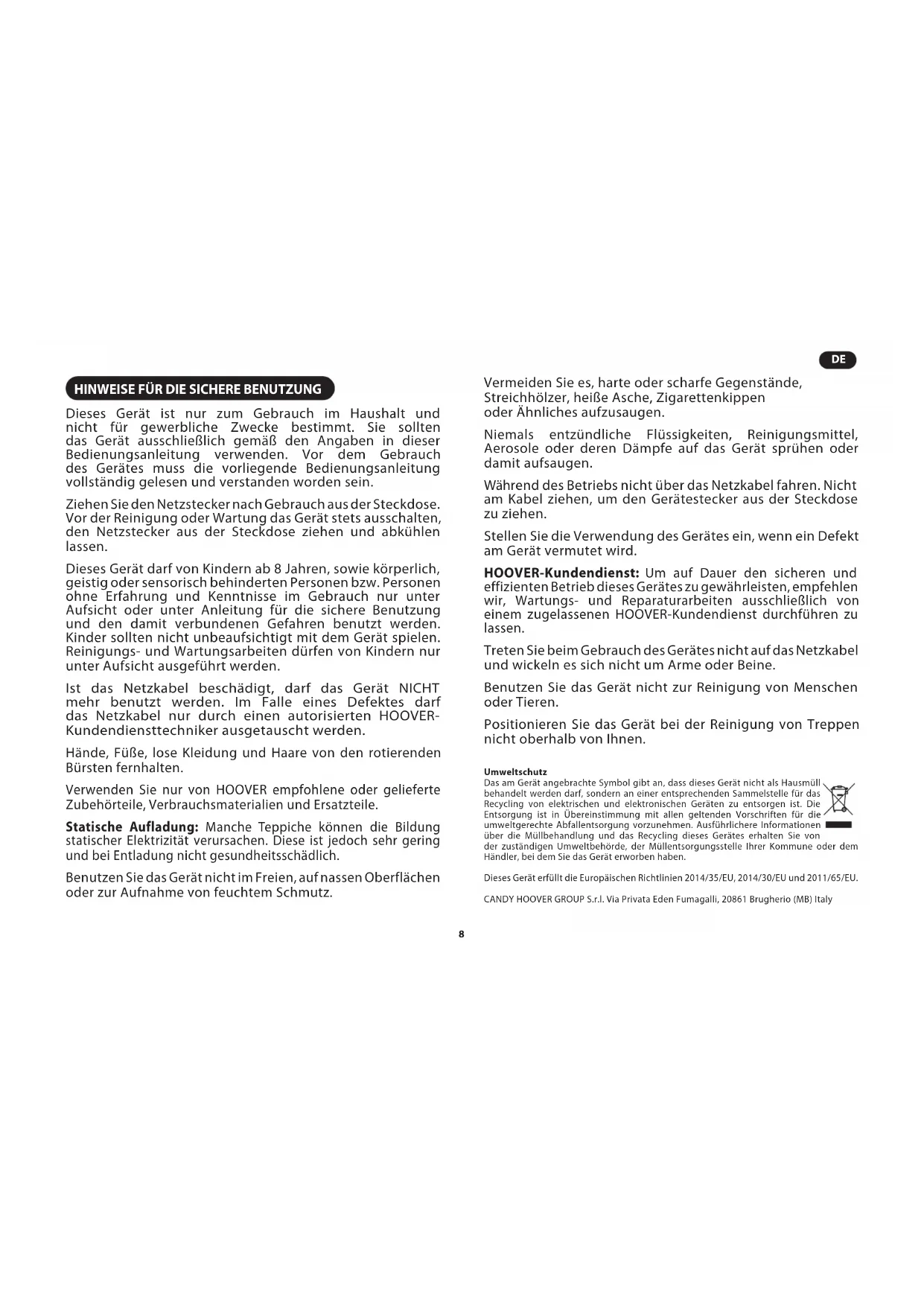 - L’aspirateur a-t-il surchaué ? Si c’est le cas, il lui faudra environ 30 minutes pour se réinitialiser automatiquement.HINWEISE FÜR DIE SICHERE BENUTZUNG Dieses Gerät ist nur zum Gebrauch im Haushalt und nicht für gewerbliche Zwecke bestimmt. Sie sollten das Gerät ausschließlich gemäß den Angaben in dieser Bedienungsanleitung verwenden. Vor dem Gebrauch des Gerätes muss die vorliegende Bedienungsanleitung vollständig gelesen und verstanden worden sein. Ziehen Sie den Netzstecker nach Gebrauch aus der Steckdose. Vor der Reinigung oder Wartung das Gerät stets ausschalten, den Netzstecker aus der Steckdose ziehen und abkühlen lassen. Dieses Gerät darf von Kindern ab 8 Jahren, sowie körperlich, geistig oder sensorisch behinderten Personen bzw. Personen ohne Erfahrung und Kenntnisse im Gebrauch nur unter Aufsicht oder unter Anleitung für die sichere Benutzung und den damit verbundenen Gefahren benutzt werden. Kinder sollten nicht unbeaufsichtigt mit dem Gerät spielen. Reinigungs- und Wartungsarbeiten dürfen von Kindern nur unter Aufsicht ausgeführt werden. Ist das Netzkabel beschädigt, darf das Gerät NICHT mehr benutzt werden. Im Falle eines Defektes darf das Netzkabel nur durch einen autorisierten HOOVER- Kundendiensttechniker ausgetauscht werden. Hände, Füße, lose Kleidung und Haare von den rotierenden Bürsten fernhalten. Verwenden Sie nur von HOOVER empfohlene oder gelieferte Zubehörteile, Verbrauchsmaterialien und Ersatzteile. Statische Aufladung: Manche Teppiche können die Bildung statischer Elektrizität verursachen. Diese ist jedoch sehr gering und bei Entladung nicht gesundheitsschädlich. Benutzen Sie das Gerät nicht im Freien, auf nassen Oberflächen oder zur Aufnahme von feuchtem Schmutz. Vermeiden Sie es, harte oder scharfe Gegenstände, Streichhölzer, heiße Asche, Zigarettenkippen oder Ähnliches aufzusaugen. Niemals entzündliche Flüssigkeiten, Reinigungsmittel, Aerosole oder deren Dämpfe auf das Gerät sprühen oder damit aufsaugen. Während des Betriebs nicht über das Netzkabel fahren. Nicht am Kabel ziehen, um den Gerätestecker aus der Steckdose zu ziehen. Stellen Sie die Verwendung des Gerätes ein, wenn ein Defekt am Gerät vermutet wird. HOOVER-Kundendienst: Um auf Dauer den sicheren und effizienten Betrieb dieses Gerätes zu gewährleisten, empfehlen wir, Wartungs- und Reparaturarbeiten ausschließlich von einem zugelassenen HOOVER-Kundendienst durchführen zu lassen. Treten Sie beim Gebrauch des Gerätes nicht auf das Netzkabel und wickeln es sich nicht um Arme oder Beine. Benutzen Sie das Gerät nicht zur Reinigung von Menschen oder Tieren. Positionieren Sie das Gerät bei der Reinigung von Treppen nicht oberhalb von Ihnen. Umweltschutz Das am Gerät angebrachte Symbol gibt an, dass dieses Gerät nicht als Hausmüll behandelt werden darf, sondern an einer entsprechenden Sammelstelle für das Recycling von elektrischen und elektronischen Geräten zu entsorgen ist. Die Entsorgung ist in Übereinstimmung mit allen geltenden Vorschriften für die umweltgerechte Abfallentsorgung vorzunehmen. Ausführlichere Informationen über die Müllbehandlung und das Recycling dieses Gerätes erhalten Sie von der zuständigen Umweltbehörde, der Müllentsorgungsstelle Ihrer Kommune oder dem Händler, bei dem Sie das Gerät erworben haben. Dieses Gerät erfüllt die Europäischen Richtlinien 2014/35/EU, 2014/30/EU und 2011/65/EU. CANDY HOOVER GROUP S.r.l. Via Privata Eden Fumagalli, 20861 Brugherio (MB) Italy