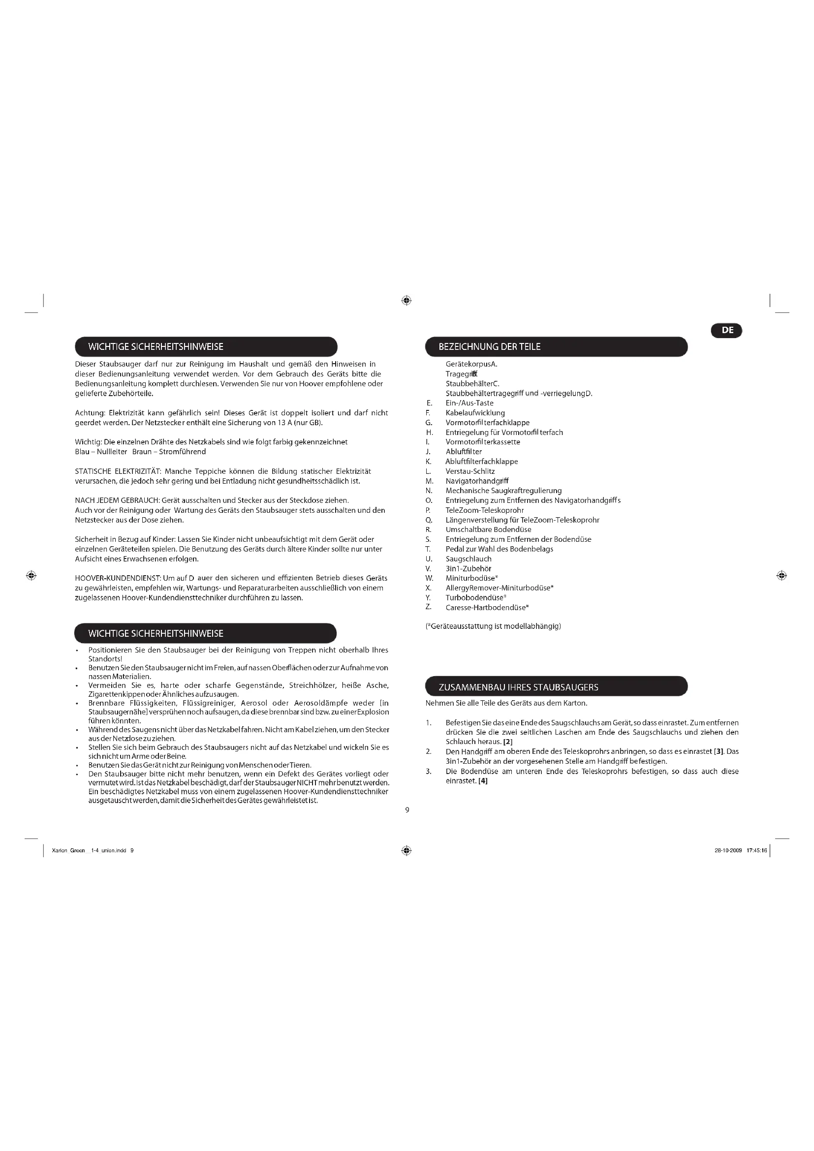 (*Geräteausstattung ist modellabhängig) Nehmen Sie alle Teile des Geräts aus dem Karton. Befestigen Sie das eine Ende des Saugschlauchs am Gerät, so dass einrastet. Zum entfernen 1. drücken Sie die zwei seitlichen Laschen am Ende des Saugschlauchs und ziehen den Schlauch heraus. [2] Den Handgr am oberen Ende des Teleskoprohrs anbringen, so dass es einrastet 2. [3]. Das 3in1-Zubehör an der vorgesehenen Stelle am Handgr festigen. Die Bodendüse am unteren Ende des Teleskoprohrs befestigen, so dass auch diese 3. einrastet. [4] Positionieren Sie den Staubsauger bei der Reinigung von Treppen nicht oberhalb Ihres • Standorts! Benutzen Sie den Staubsauger nicht im Freien, auf nassen Ober ächen oder zur Aufnahme von • nassen Materialien. Vermeiden Sie es, harte oder scharfe Gegenstände, Streichhölzer, heiße Asche, • Zigarettenkippen oder Ähnliches aufzusaugen. Brennbare Flüssigkeiten, Flüssigreiniger, Aerosol oder Aerosoldämpfe weder [in • Staubsaugernähe] versprühen noch aufsaugen, da diese brennbar sind bzw. zu einer Explosion führen könnten. Während des Saugens nicht über das Netzkabel fahren. Nicht am Kabel ziehen, um den Stecker • aus der Netz dose zu ziehen. Stellen Sie sich beim Gebrauch des Staubsaugers nicht auf das Netzkabel und wickeln Sie es • sich nicht um Arme oder Beine. Benutzen Sie das Gerät nicht zur Reinigung von Menschen oder Tieren.• Den Staubsauger bitte nicht mehr benutzen, wenn ein Defekt des Gerätes vorliegt oder • vermutet wird. Ist das Netzkabel beschädigt, darf der Staubsauger NICHT mehr benutzt werden. Ein beschädigtes Netzkabel muss von einem zugelassenen Hoover-Kundendiensttech niker ausgetauscht werden, damit die Sicherheit des Gerätes gewährleistet ist. Xarion_Green__1-4_union.indd 9 28-10-2009 17:45:16 Z.10