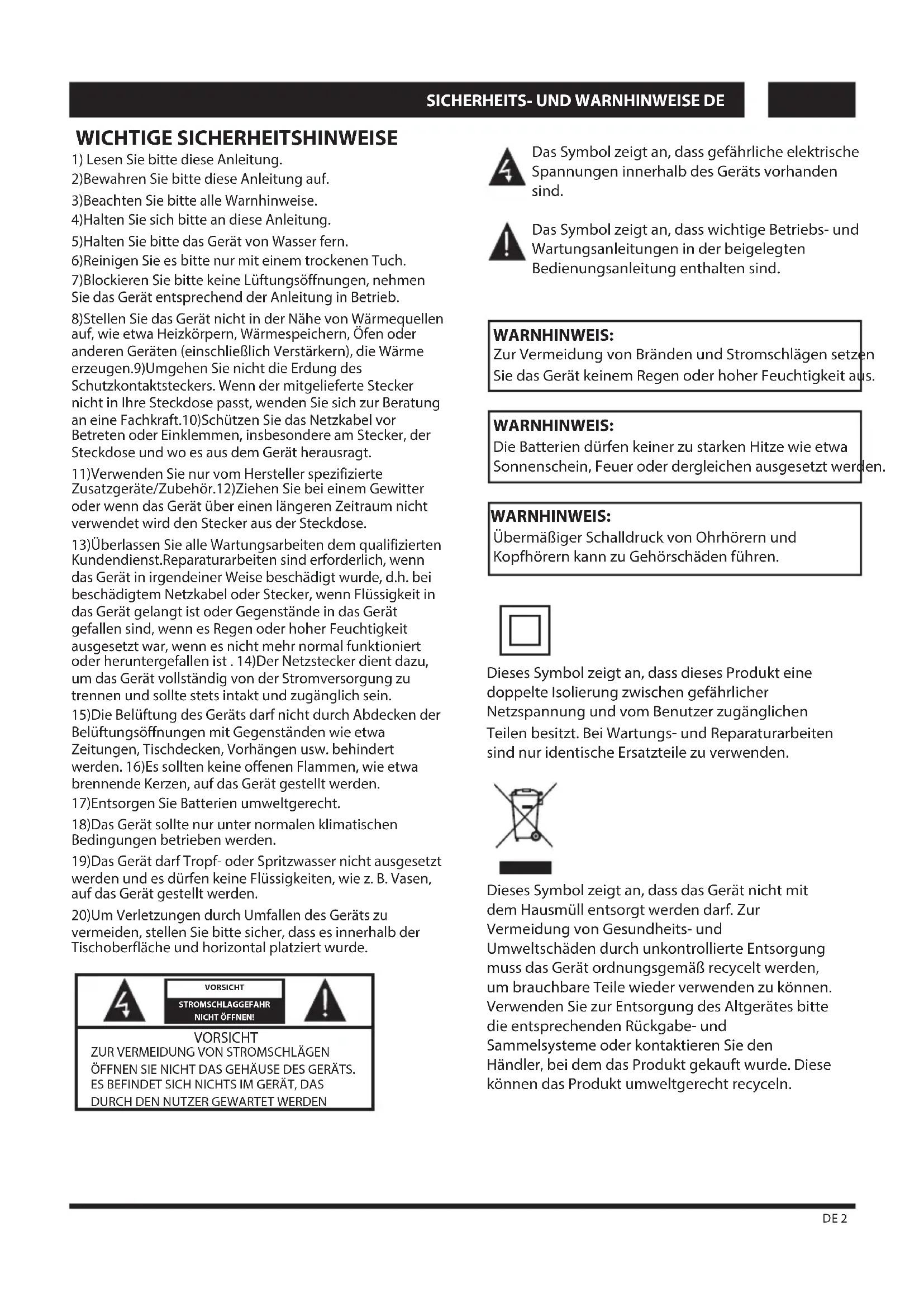 2)Bewahren Sie bitte diese Anleitung auf. 3)Beachten Sie bitte alle Warnhinweise. 4)Halten Sie sich bitte an diese Anleitung. 5)Halten Sie bitte das Gerät von Wasser fern. 6)Reinigen Sie es bitte nur mit einem trockenen Tuch. 7)Blockieren Sie bitte keine Lüftungsöffnungen, nehmen Sie das Gerät entsprechend der Anleitung in Betrieb. 8)Stellen Sie das Gerät nicht in der Nähe von Wärmequellen auf, wie etwa Heizkörpern, Wärmespeichern, Öfen oder anderen Geräten (einschließlich Verstärkern), die Wärme erzeugen.9)Umgehen Sie nicht die Erdung des Schutzkontaktsteckers. Wenn der mitgelieferte Stecker nicht in Ihre Steckdose passt, wenden Sie sich zur Beratung an eine Fachkraft.10)Schützen Sie das Netzkabel vor Betreten oder Einklemmen, insbesondere am Stecker, der Steckdose und wo es aus dem Gerät herausragt. 11)Verwenden Sie nur vom Hersteller spezifizierte Zusatzgeräte/Zubehör.12)Ziehen Sie bei einem Gewitter oder wenn das Gerät über einen längeren Zeitraum nicht verwendet wird den Stecker aus der Steckdose. 13)Überlassen Sie alle Wartungsarbeiten dem qualifizierten Kundendienst.Reparaturarbeiten sind erforderlich, wenn das Gerät in irgendeiner Weise beschädigt wurde, d.h. bei beschädigtem Netzkabel oder Stecker, wenn Flüssigkeit in das Gerät gelangt ist oder Gegenstände in das Gerät gefallen sind, wenn es Regen oder hoher Feuchtigkeit ausgesetzt war, wenn es nicht mehr normal funktioniert oder heruntergefallen ist . 14)Der Netzstecker dient dazu, um das Gerät vollständig von der Stromversorgung zu trennen und sollte stets intakt und zugänglich sein. 15)Die Belüftung des Geräts darf nicht durch Abdecken der Belüftungsöffnungen mit Gegenständen wie etwa Zeitungen, Tischdecken, Vorhängen usw. behindert werden. 16)Es sollten keine offenen Flammen, wie etwa brennende Kerzen, auf das Gerät gestellt werden. 17)Entsorgen Sie Batterien umweltgerecht. 18)Das Gerät sollte nur unter normalen klimatischen Bedingungen betrieben werden. 19)Das Gerät darf Tropf- oder Spritzwasser nicht ausgesetzt werden und es dürfen keine Flüssigkeiten, wie z. B. Vasen, auf das Gerät gestellt werden. 20)Um Verletzungen durch Umfallen des Geräts zu vermeiden, stellen Sie bitte sicher, dass es innerhalb der Tischoberfläche und horizontal platziert wurde. Dieses Symbol zeigt an, dass dieses Produkt eine doppelte Isolierung zwischen gefährlicher Netzspannung und vom Benutzer zugänglichen Teilen besitzt. Bei Wartungs- und Reparaturarbeiten sind nur identische Ersatzteile zu verwenden. Dieses Symbol zeigt an, dass das Gerät nicht mit dem Hausmüll entsorgt werden darf. Zur Vermeidung von Gesundheits- und Umweltschäden durch unkontrollierte Entsorgung muss das Gerät ordnungsgemäß recycelt werden, um brauchbare Teile wieder verwenden zu können. Verwenden Sie zur Entsorgung des Altgerätes bitte die entsprechenden Rückgabe- und Sammelsysteme oder kontaktieren Sie den Händler, bei dem das Produkt gekauft wurde. Diese können das Produkt umweltgerecht recyceln. ZUR VERMEIDUNG VON STROMSCHLÄGEN ÖFFNEN SIE NICHT DAS GEHÄUSE DES GERÄTS. ES BEFINDET SICH NICHTS IM GERÄT, DAS DURCH DEN NUTZER GEWARTET WERDEN VORSICHT