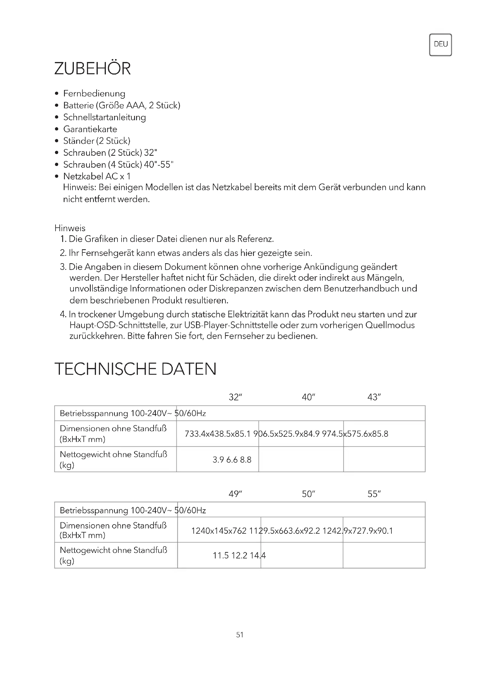 Haupt-OSD-Schnittstelle, zur USB-Player-Schnittstelle oder zum vorherigen Quellmodus zurückkehren. Bitte fahren Sie fort, den Fernseher zu bedienen. 32” 49” 40” 50” Betriebsspannung 100-240V~ 50/60Hz Dimensionen ohne Standfuß (BxHxT mm) 733.4x438.5x85.1 906.5x525.9x84.9 974.5x575.6x85.8 Nettogewicht ohne Standfuß (kg)