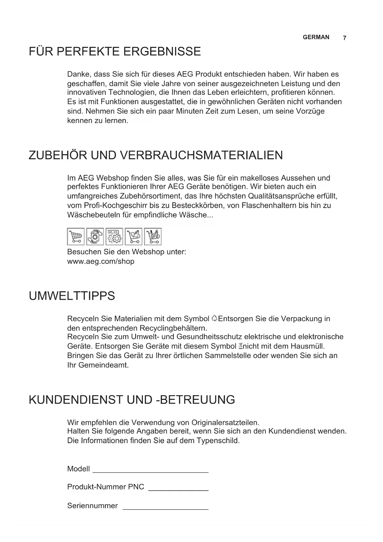Besuchen Sie den Webshop unter: www.aeg.com/shop UMWELTTIPPS Recyceln Sie Materialien mit dem Symbol . Entsorgen Sie die Verpackung in