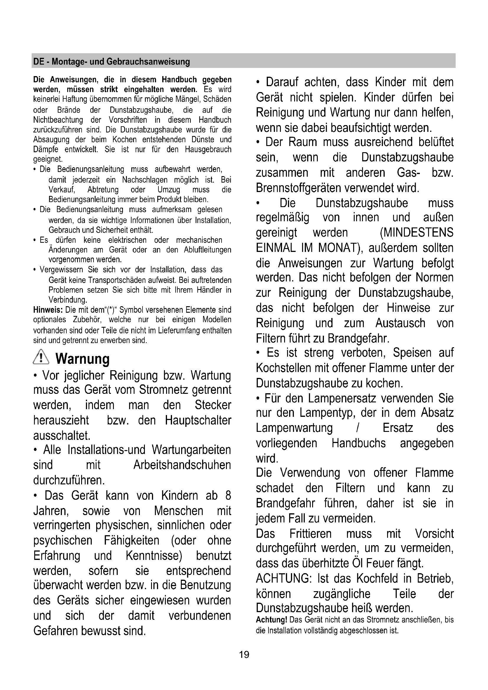 Replacer la grille. Dans l’éventualité où l’éclairage ne devait pas fonctionner, vérifier si les lampes ont été introduites correctement dans leur logement, avant de contacter le service après-vente.19 DE - Montage- und Gebrauchsanweisung Die Anweisungen, die in diesem Handbuch gegeben werden, müssen strikt eingehalten werden. Es wird keinerlei Haftung übernommen für mögliche Mängel, Schäden oder Brände der Dunstabzugshaube, die auf die Nichtbeachtung der Vorschriften in diesem Handbuch zurückzuführen sind. Die Dunstabzugshaube wurde für die Absaugung der beim Kochen entstehenden Dünste und Dämpfe entwickelt. Sie ist nur für den Hausgebrauch geeignet.