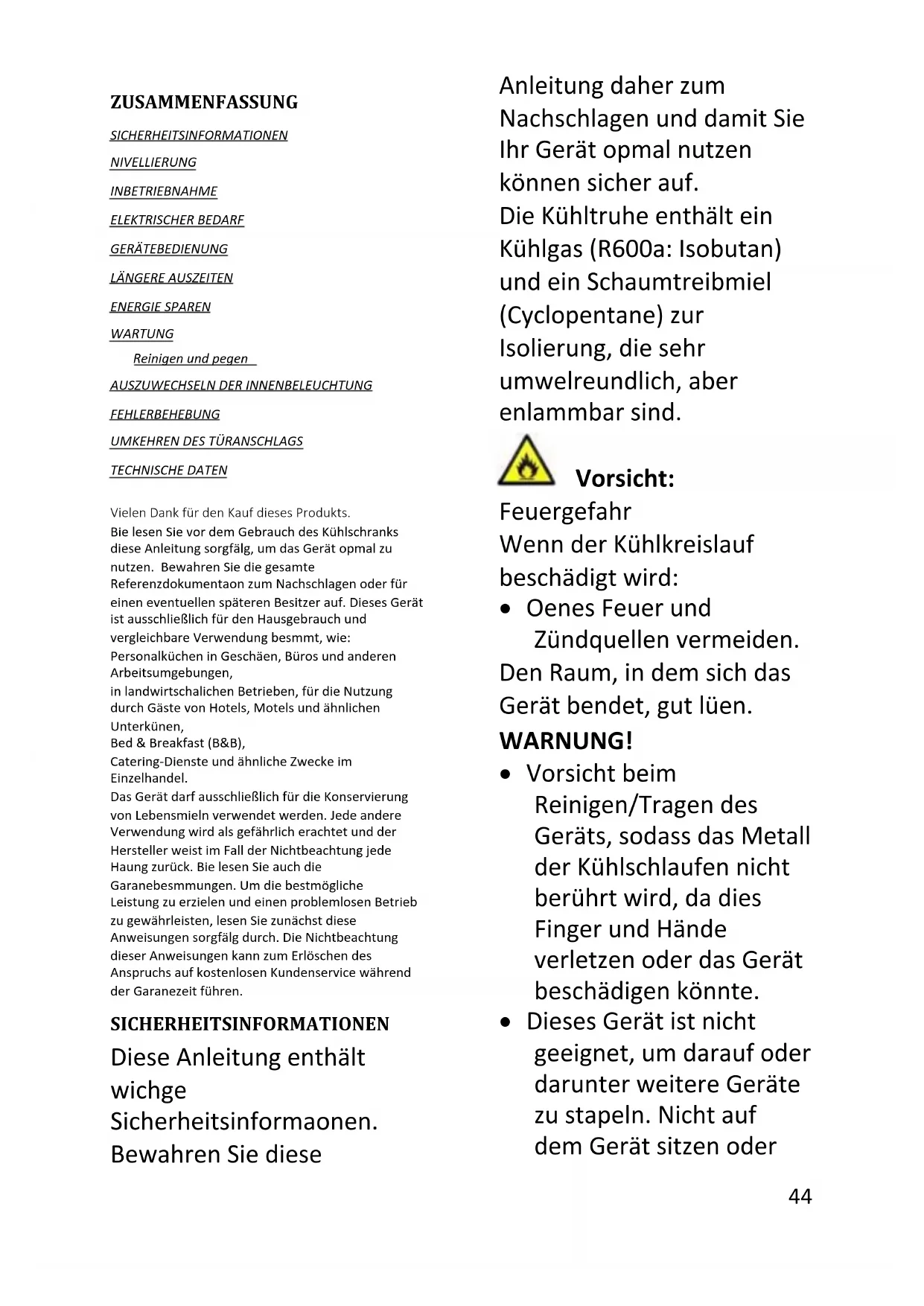 Este electrodoméstico cumple la directiva europea 2012/19/EU en materia de Residuos de Aparatos Eléctricos y Electrónicos (RAEE). Los RAEE contienen tanto sustancias contaminantes (que pueden conllevar consecuencias negativas para el medio ambiente) como componentes básicos (que se pueden reutilizar). Es importante que los RAEE se sometan a tratamientos específicos para eliminar y desechar adecuadamente los contaminantes y recuperar y reciclar todos los materiales. Las personas desempeñan un papel clave a la hora de garantizar que los RAEE no se conviertan en un problema medioambiental. Para ello, es esencial seguir ciertas normas básicas: Los RAEE no deben recibir el mismo tratamiento que los residuos domésticos. Los RAEE deben depositarse en los puntos limpios pertinentes, gestionados por las autoridades locales o por empresas autorizadas. En muchos países, existe un servicio de recogida a domicilio de RAEE de gran tamaño. En muchos países, al comprar un electrodoméstico nuevo, el distribuidor podría encargarse de la recogida del antiguo de forma totalmente gratuita, siempre y cuando el equipo tenga características similares y sea del mismo tipo que el equipo suministrado. Conformidad Mediante la colocación de la marca en este producto confirmamos el cumplimiento de todos los requisitos legislativos europeos relevantes en materia de seguridad, salud y medio ambiente establecidos para este producto.44 Deutsch ZUSAMMENFASSUNG SICHERHEITSINFORMATIONEN NIVELLIERUNG INBETRIEBNAHME ELEKTRISCHER BEDARF GERÄTEBEDIENUNG LÄNGERE AUSZEITEN ENERGIE SPAREN WARTUNG Reinigen und pflegen AUSZUWECHSELN DER INNENBELEUCHTUNG FEHLERBEHEBUNG UMKEHREN DES TÜRANSCHLAGS TECHNISCHE DATEN Vielen Dank für den Kauf dieses Produkts. Bitte lesen Sie vor dem Gebrauch des Kühlschranks diese Anleitung sorgfältig, um das Gerät optimal zu nutzen. Bewahren Sie die gesamte Referenzdokumentation zum Nachschlagen oder für einen eventuellen späteren Besitzer auf. Dieses Gerät ist ausschließlich für den Hausgebrauch und vergleichbare Verwendung bestimmt, wie: Personalküchen in Geschäften, Büros und anderen Arbeitsumgebungen, in landwirtschaftlichen Betrieben, für die Nutzung durch Gäste von Hotels, Motels und ähnlichen Unterkünften, Bed & Breakfast (B&B), Catering-Dienste und ähnliche Zwecke im Einzelhandel. Das Gerät darf ausschließlich für die Konservierung von Lebensmitteln verwendet werden. Jede andere Verwendung wird als gefährlich erachtet und der Hersteller weist im Fall der Nichtbeachtung jede Haftung zurück. Bitte lesen Sie auch die Garantiebestimmungen. Um die bestmögliche Leistung zu erzielen und einen problemlosen Betrieb zu gewährleisten, lesen Sie zunächst diese Anweisungen sorgfältig durch. Die Nichtbeachtung dieser Anweisungen kann zum Erlöschen des Anspruchs auf kostenlosen Kundenservice während der Garantiezeit führen. SICHERHEITSINFORMATIONEN Diese Anleitung enthält wichtige Sicherheitsinformationen. Bewahren Sie diese Anleitung daher zum Nachschlagen und damit Sie Ihr Gerät optimal nutzen können sicher auf. Die Kühltruhe enthält ein Kühlgas (R600a: Isobutan) und ein Schaumtreibmittel (Cyclopentane) zur Isolierung, die sehr umweltfreundlich, aber entflammbar sind. Vorsicht: Feuergefahr Wenn der Kühlkreislauf beschädigt wird: