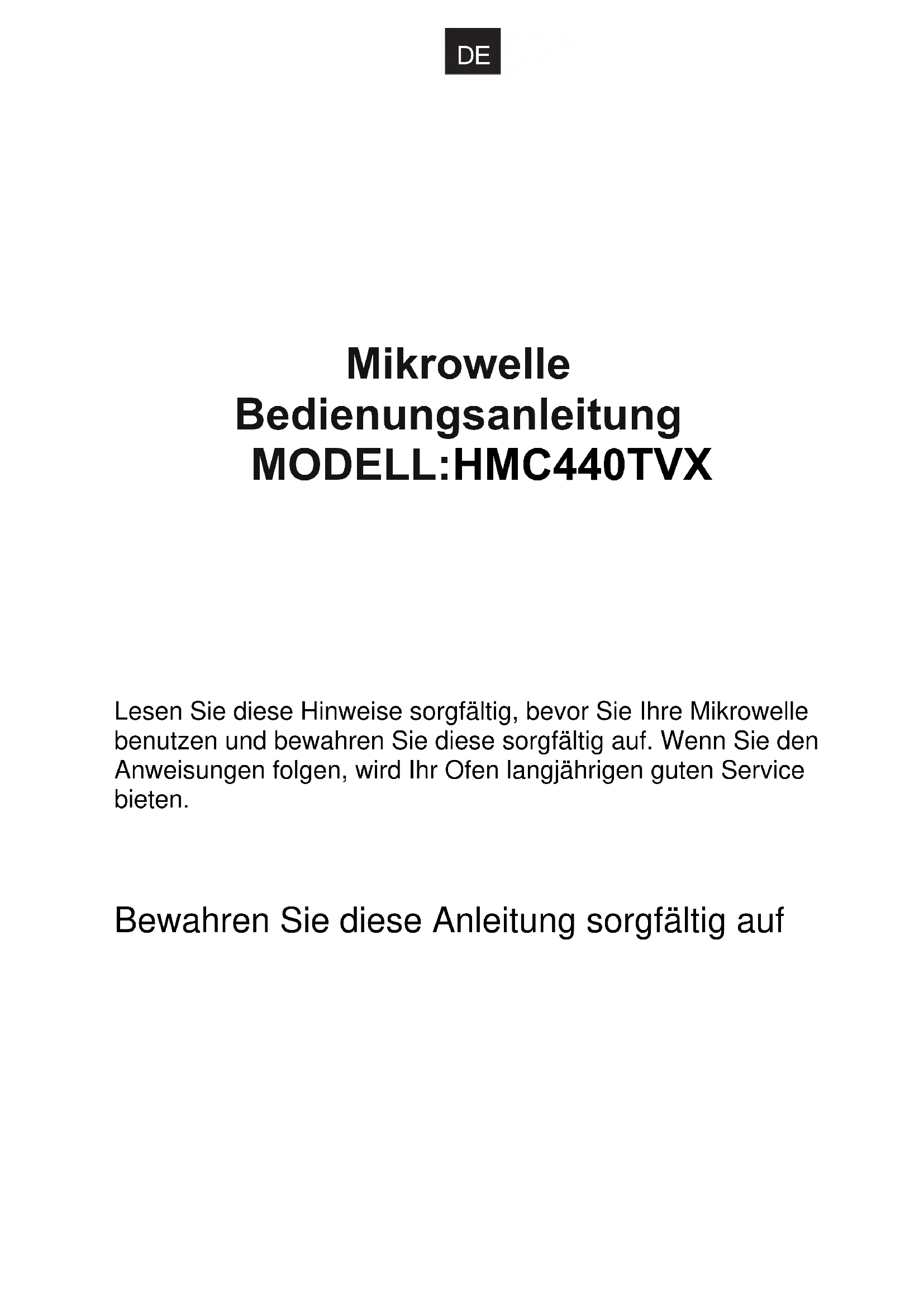 (a) Versuchen Sie nicht, diesen Ofen bei geöffneter Tür zu betreiben, da dies zu schädlicher Mikrowellen- Strahlung führen kann. Es ist wichtig, die Sicherheitss perren nicht zu brechen oder zu manipulieren. (b) Stellen Sie keine Gegenstände zwischen die Backofen-Vorderseite und die Tür, vermeiden Sie Schmutz oder Rückstände von Reinigungsmitteln auf Dichtungen. (c) WARNUNG: Wenn die Tür oder Türdichtungen beschädigt sind, darf der Ofen nicht betrieben werden bis dieser von einer sachkundigen Person repariert worden ist. NACHTRAG Wenn das Gerät nicht sauber gehalten wird, können die Oberflächen angegriffen werden und beeinflussen dann die Lebensdauer des Gerätes und können zu gefährlichen Situationen führen. VERMEIDUNG von möglicher Mikrowellenstrahlung HMC440Rated Input Power(Doppelgrill): Rated Input Power(Mikrowelle+Grill): 2300W0W335 TVX