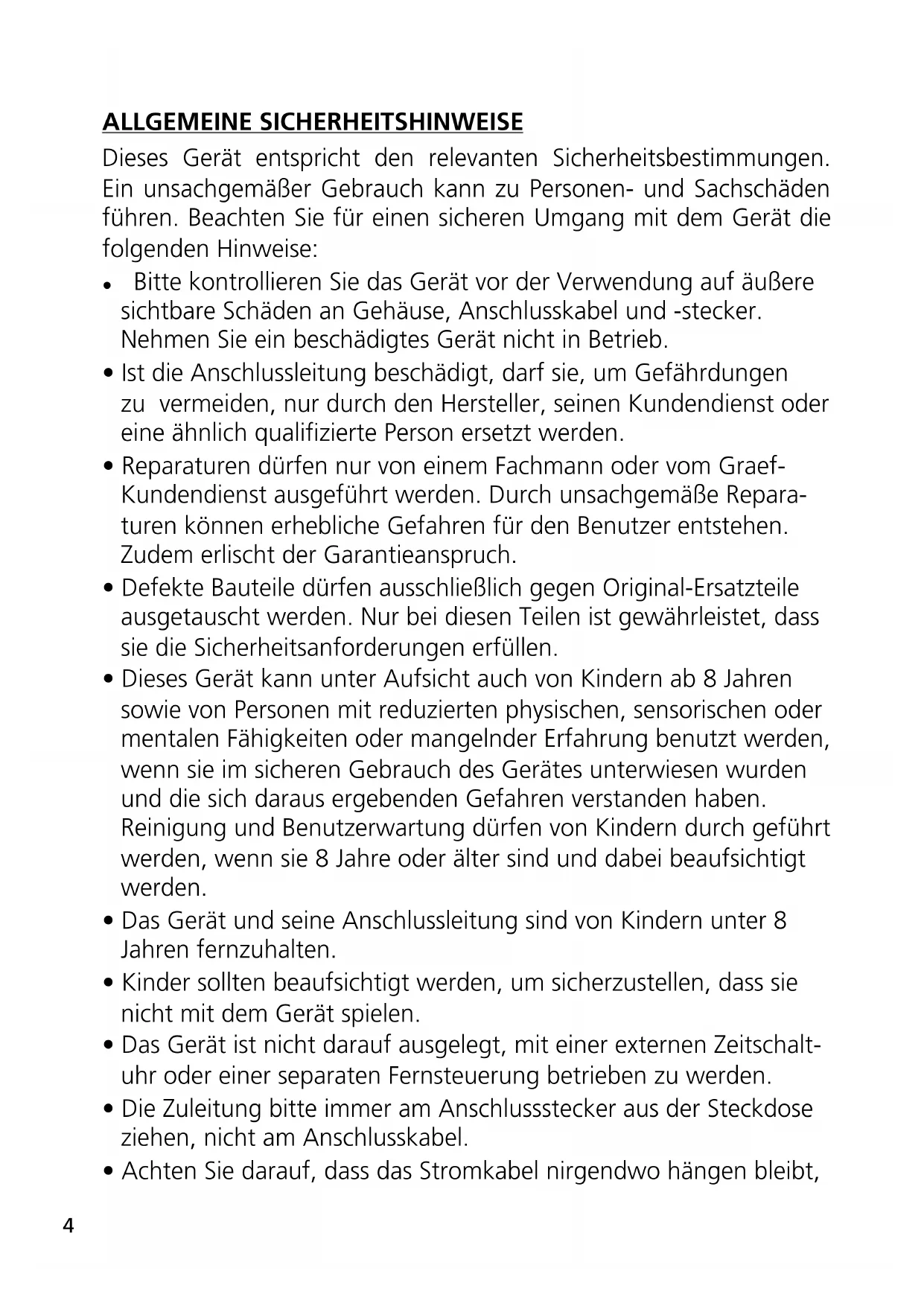 - Reparaturen dürfen nur von einem Fachmann oder vom Graef- Kundendienst ausgeführt werden. Durch unsachgemäße Repara- turen können erhebliche Gefahren für den Benutzer entstehen. Zudem erlischt der Garantieanspruch.