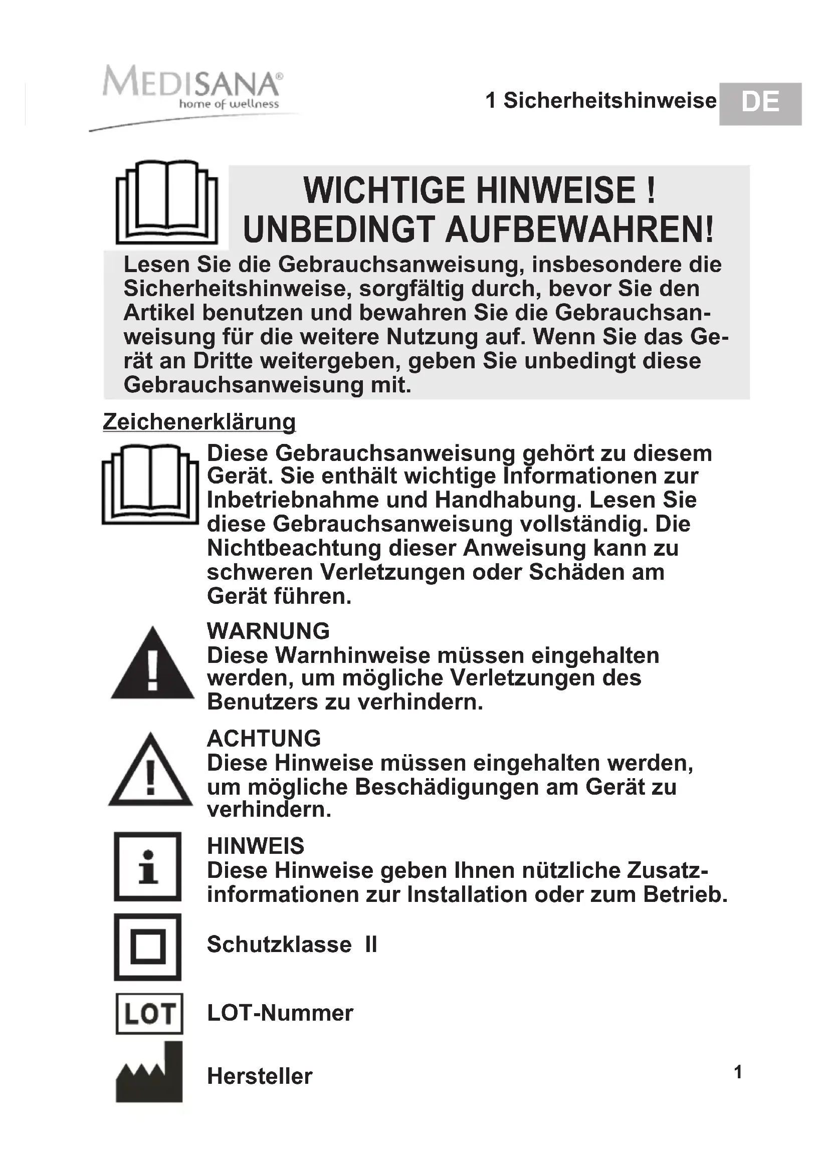 1 Sicherheitshinweise Diese Gebrauchsanweisung gehört zu diesem Gerät. Sie enthält wichtige Informationen zur Inbetriebnahme und Handhabung. Lesen Sie diese Gebrauchsanweisung vollständig. Die Nichtbeachtung dieser Anweisung kann zu schweren Verletzungen oder Schäden am Gerät führen. WARNUNG Diese Warnhinweise müssen eingehalten werden, um mögliche Verletzungen des Benutzers zu verhindern. ACHTUNG Diese Hinweise müssen eingehalten werden, um mögliche Beschädigungen am Gerät zu verhindern. HINWEIS Diese Hinweise geben Ihnen nützliche Zusatz- informationen zur Installation oder zum Betrieb. Schutzklasse II Zeichenerklärung LOT-Nummer Hersteller WICHTIGE HINWEISE ! UNBEDINGT AUFBEWAHREN! Lesen Sie die Gebrauchsanweisung, insbesondere die Sicherheitshinweise, sorgfältig durch, bevor Sie den Artikel benutzen und bewahren Sie die Gebrauchsan- weisung für die weitere Nutzung auf. Wenn Sie das Ge- rät an Dritte weitergeben, geben Sie unbedingt diese Gebrauchsanweisung mit.2