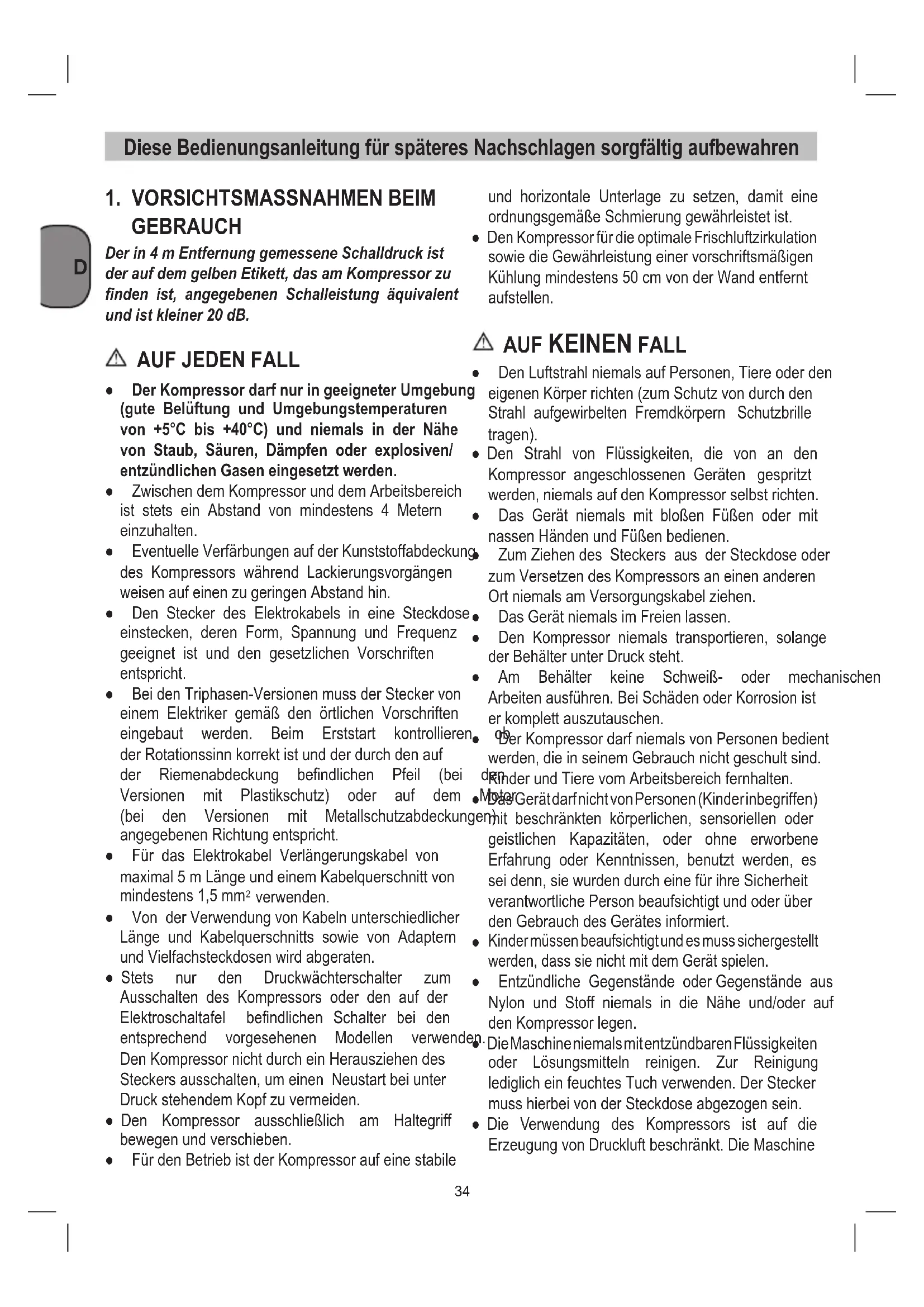 ● DenLuftstrahlniemalsaufPersonen,Tiereoderden eigenenKörperrichten(zumSchutzvondurchden Strahl aufgewirbelten Fremdkörpern Schutzbrille tragen). ● Den Strahl von Flüssigkeiten, die von an den Kompressor angeschlossenen Geräten gespritzt werden,niemalsaufdenKompressorselbstrichten. ● Das Gerät niemals mit bloßen Füßen oder mit nassenHändenundFüßenbedienen. ● Zum Ziehen des Steckers aus der Steckdose oder zum Versetzen des Kompressors an einen anderen OrtniemalsamVersorgungskabelziehen. ● DasGerätniemalsimFreienlassen. ● Den Kompressor niemals transportieren, solange derBehälterunterDrucksteht. ● Am Behälter keine Schweiß- oder mechanischen Arbeitenausführen.BeiSchädenoderKorrosionist erkomplettauszutauschen. ● Der Kompressor darf niemals von Personen bedient werden,dieinseinemGebrauchnichtgeschultsind. KinderundTierevomArbeitsbereichfernhalten. ● DasGerätdarfnichtvonPersonen(Kinderinbegriffen) mit beschränkten körperlichen, sensoriellen oder geistlichen Kapazitäten, oder ohne erworbene Erfahrung oder Kenntnissen, benutzt werden, es sei denn, sie wurden durch eine für ihre Sicherheit verantwortliche Person beaufsichtigt und oder über denGebrauchdesGerätesinformiert.