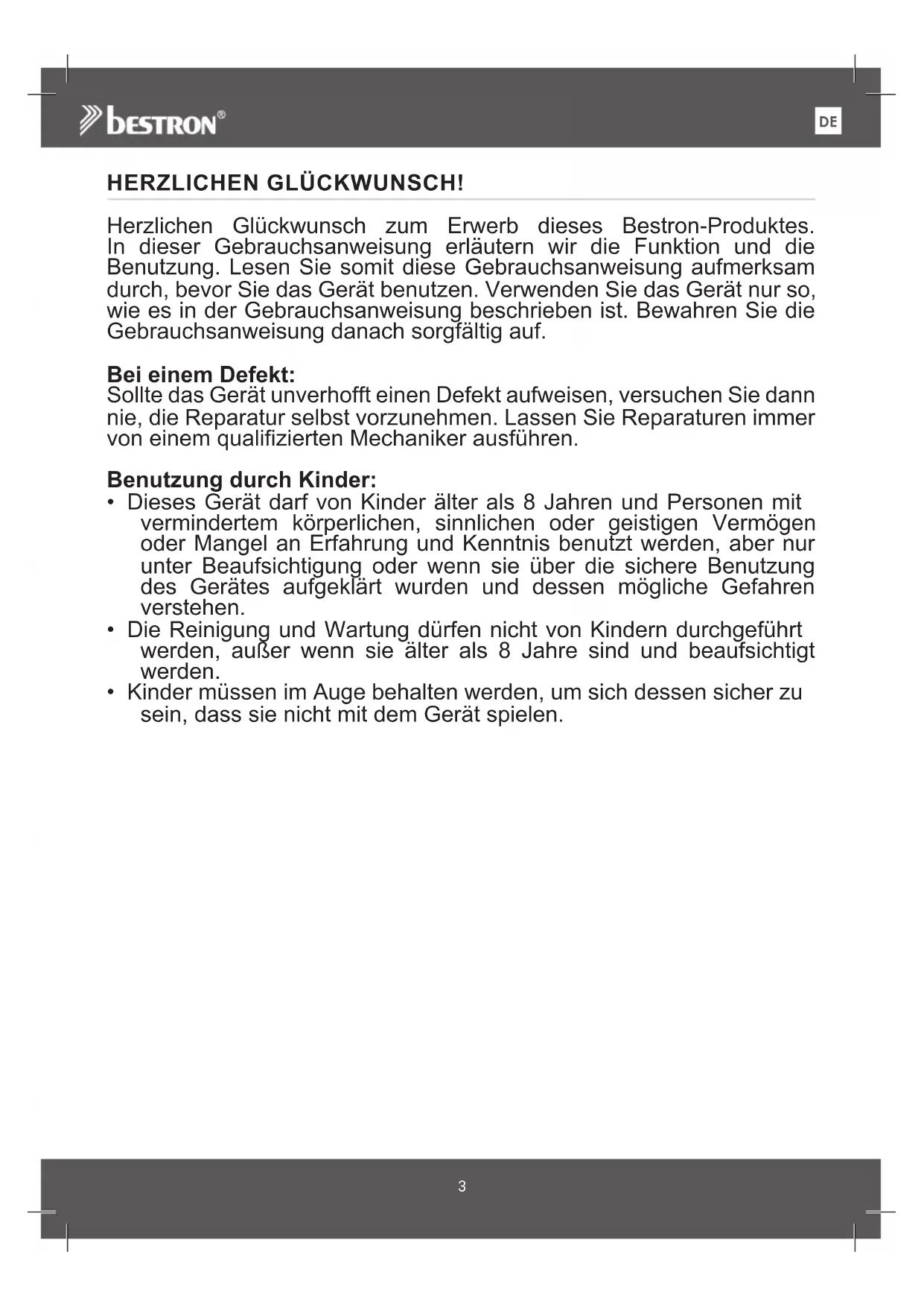 EHERZLICHEN GLÜCKWUNSCH! Herzlichen Glückwunsch zum Erwerb dieses Bestron-Produktes. In dieser Gebrauchsanweisung erläutern wir die Funktion und die Benutzung. Lesen Sie somit diese Gebrauchsanweisung aufmerksam durch, bevor Sie das Gerät benutzen. Verwenden Sie das Gerät nur so, wie es in der Gebrauchsanweisung beschrieben ist. Bewahren Sie die Gebrauchsanweisung danach sorgfältig auf. Bei einem Defekt: Sollte das Gerät unverhofft einen Defekt aufweisen, versuchen Sie dann nie, die Reparatur selbst vorzunehmen. Lassen Sie Reparaturen immer von einem qualifizierten Mechaniker ausführen. Benutzung durch Kinder: