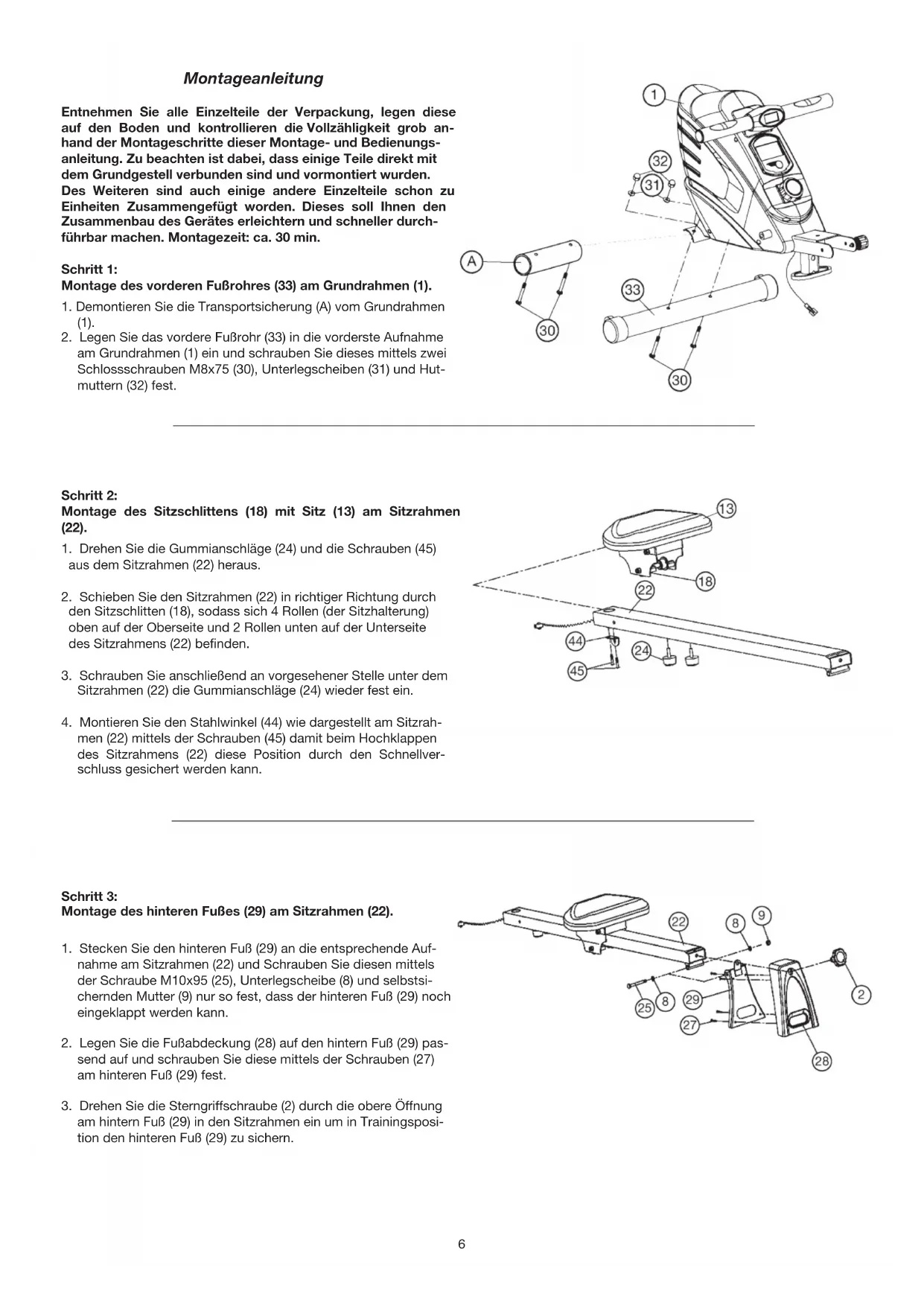- Vor der ersten Benutzung und in regelmässigen Abständen den festen Sitz aller Schrauben, Muttern und sonstigen Verbindungen prufen, damit der sichere Betriebszustand des Trainingsgerätes gewährleistet ist.