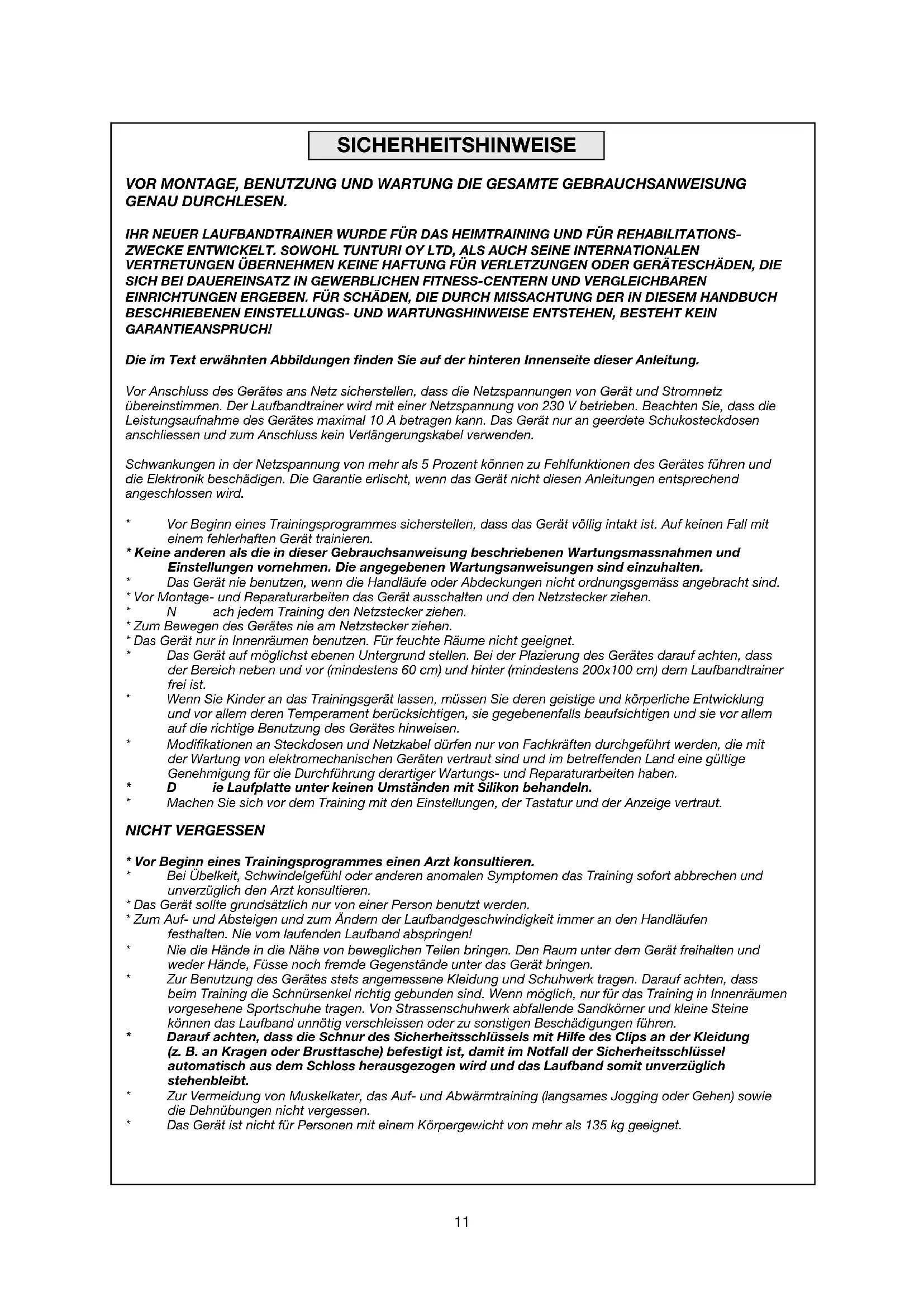 drücken. TRANSPORT UND AUFBEWAHRUNG Das Gerät lässt sich leicht auf den integrierten Transport- rollen bewegen. Vor dem Transport das Netzkabel sowohl aus der Steckdose als auch aus der Buchse am Laufband- trainer ziehen. Das Gerät am hinteren Ende anheben und auf den Transportrollen an den gewünschten Platz schieben. BITTE BEACHTEN! Nach dem Bewegen oder Transport muss das Laufband ggf. neu ausgerichtet werden. Um Funktionsstörungen zu vermeiden, das Gerät in einem möglichst trockenen Raum mit gleichbleibender Temperatur vor Staub geschützt aufbewahren und benutzen. Nach jedem Training den Netzstecker ziehen. TECHNISCHE DATEN Länge 150 cm Breite 90 cm Höhe 125 cm Gewicht 71 kg Lauffläche 135 x 44 cm Geschwindigkeit 1,5-16 km/h Steigung 0-10 % Motor 1,5 PS Zul. Körpergewicht max. 135 kg Sämtliche Tunturi-Geräte entsprechen den EG-Richtlinien für elektromagnetische Verträglichkeit (EMC) und sind zum Zeichen der Konformität mit einem CE gekennzeichnet. Tunturi-Laufbänder erfüllen die Anforderungen der DIN- Präzisions- und Sicherheitsnormen (DIN 32933-1+3). BITTE BEACHTEN! Es ist wichtig, dass die in dieser Betriebsanleitung angegebenen Hinweise beachtet werden. Für Schäden, die durch Missachtung der angegebenen Montage-, Einstellungs- und Wartungs- hinweise entstehen, besteht kein Garantieanspruch. Werden Modifizierungen ohne das Einverständnis der Tunturi Oy Ltd vorgenommen, soll das Gerät nicht verwerdet werden und jeglicher Garantieanspruch erlischt. Technische Änderungen vorbehalten - Sie dienen stets dem Fortschritt.20