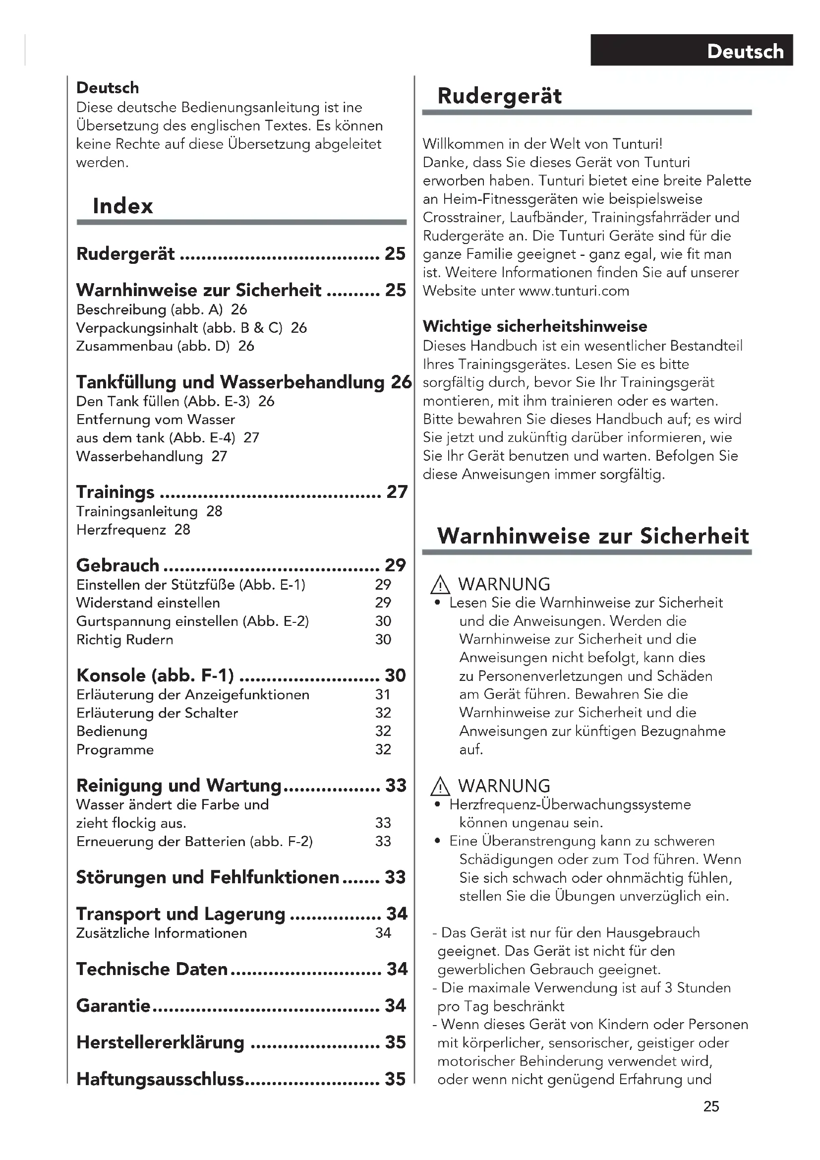 - Eine Überanstrengung kann zu schweren Schädigungen oder zum Tod führen. Wenn Sie sich schwach oder ohnmächtig fühlen, stellen Sie die Übungen unverzüglich ein. - Das Gerät ist nur für den Hausgebrauch geeignet. Das Gerät ist nicht für den gewerblichen Gebrauch geeignet. - Die maximale Verwendung ist auf 3 Stunden pro Tag beschränkt - Wenn dieses Gerät von Kindern oder Personen mit körperlicher, sensorischer, geistiger oder motorischer Behinderung verwendet wird, oder wenn nicht genügend Erfahrung und Deutsch Diese deutsche Bedienungsanleitung ist ine Übersetzung des englischen Textes. Es können keine Rechte auf diese Übersetzung abgeleitet werden. Index Rudergerät ..................................... 25 Warnhinweise zur Sicherheit .......... 25 Beschreibung (abb. A) 26 Verpackungsinhalt (abb. B & C) 26 Zusammenbau (abb. D) 26 Tankfüllung und Wasserbehandlung 26 Den Tank füllen (Abb. E-3) 26 Entfernung vom Wasser aus dem tank (Abb. E-4) 27 Wasserbehandlung 27 Trainings ......................................... 27 Trainingsanleitung 28 Herzfrequenz 28 Gebrauch ........................................ 29 Einstellen der Stützfüße (Abb. E-1) 29 Widerstand einstellen 29 Gurtspannung einstellen (Abb. E-2) 30 Richtig Rudern 30 Konsole (abb. F-1) .......................... 30 Erläuterung der Anzeigefunktionen 31 Erläuterung der Schalter 32 Bedienung 32 Programme 32 Reinigung und Wartung .................. 33 Wasser ändert die Farbe und zieht ockig aus. 33 Erneuerung der Batterien (abb. F-2) 33 Störungen und Fehlfunktionen ....... 33 Transport und Lagerung ................. 34 Zusätzliche Informationen 34 Technische Daten ............................ 34 Garantie .......................................... 34 Herstellererklärung ........................ 35 Haftungsausschluss ......................... 3526 Deutsch Kenntnisse vorhanden sind, kann dies zu Gefahrensituationen führen. Personen, die für deren Sicherheit verantwortlich sind, müssen klare Anweisungen geben oder den Gebrauch des Geräts beaufsichtigen. - Bevor Sie Ihr Training starten, nehmen Sie Kontakt mit einem Arzt auf, um Ihre Gesundheit kontrollieren zu lassen. - Falls Sie Übelkeit, ein Schwindelgefühl oder andere anormale Symptome verspüren, hören Sie unverzüglich mit Ihrem Training auf und wenden Sie sich an einen Arzt. - Um einen Muskelkater zu vermeiden, starten Sie jedes Training mit Aufwärmen und beenden Sie es mit Abkühlen. Denken Sie daran, sich am Ende des Trainings zu dehnen. - Das Gerät ist nur für den Gebrauch in geschlossenen Räumen geeignet. Das Gerät ist nicht für den Gebrauch im Freien geeignet. - Verwenden Sie das Gerät nur in Umgebungen mit ausreichender Belüftung. Verwenden Sie das Gerät nicht in zugiger Umgebung, damit Sie sich nicht erkälten. - Verwenden Sie das Gerät nur in Umgebungen mit Umgebungstemperaturen zwischen 10 °C und 35 °C. Lagern Sie das Gerät nur in Umgebungen mit einer Umgebungstemperatur zwischen 5 °C und 45 °C. - Verwenden und lagern Sie das Gerät nicht in feuchten Umgebungen. Die Luftfeuchtigkeit darf niemals 80% überschreiten. - Verwenden Sie das Gerät nur bestimmungsgemäß. Verwenden Sie das Gerät nicht für einen anderen als für den in diesem Handbuch beschriebenen Zweck. - Verwenden Sie das Gerät nicht, falls Teile beschädigt oder defekt sind. Ist ein Teil beschädigt oder defekt, wenden Sie sich an Ihren Händler. - Halten Sie Ihre Hände, Füße und andere Körperteile von den beweglichen Teilen fern. - Halten Sie Ihr Haar von den beweglichen Teilen fern. - Tragen Sie entsprechende Kleidung und Schuhe. - Halten Sie Kleidung, Schmuck und andere Gegenstände von den beweglichen Teilen fern. - Vergewissern Sie sich, dass das Gerät nur von einer Person auf einmal verwendet wird. Das Gerät darf nicht von Personen verwendet werden, deren Gewicht 150 kg (330 lbs) überschreitet. - Öffnen Sie das Gerät nicht, ohne vorher mit Ihrem Händler zu sprechen. Beschreibung (abb. A) Ihr Rudergerät ist ein ortsgebundenes Fitnessgerät, das zur Simulation des Ruderns erwendet wird, ohne dabei einen übermäßigen Druck auf die Gelenke auszuüben. Verpackungsinhalt (abb. B & C) - Die Verpackung enthält die in Abb. B dargestellten Teile. - Die Verpackung enthält die Befestigungsteile gemäß Abb. C. Siehe Abschnitt “Beschreibung”. ‼ HINWEIS