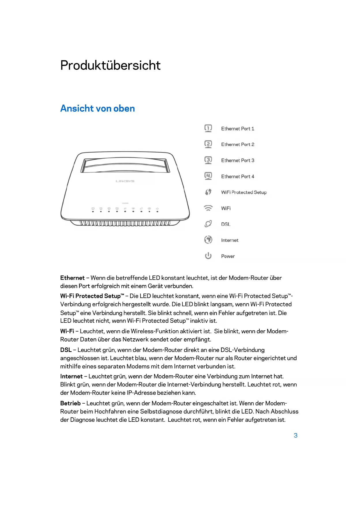 Ethernet - -- Wenn die betreffende LED konstant leuchtet, ist der Modem-Router über diesen Port erfolgreich mit einem Gerät verbunden. Wi-Fi Protected Setup™ - -- Die LED leuchtet konstant, wenn eine Wi-Fi Protected Setup™- Verbindung erfolgreich hergestellt wurde. Die LED blinkt langsam, wenn Wi-Fi Protected Setup™ eine Verbindung herstellt. Sie blinkt schnell, wenn ein Fehler aufgetreten ist. Die LED leuchtet nicht, wenn Wi-Fi Protected Setup™ inaktiv ist. Wi-Fi - -- Leuchtet, wenn die Wireless-Funktion aktiviert ist. Sie blinkt, wenn der Modem- Router Daten über das Netzwerk sendet oder empfängt. DSL - -- Leuchtet grün, wenn der Modem-Router direkt an eine DSL-Verbindung angeschlossen ist. Leuchtet blau, wenn der Modem-Router nur als Router eingerichtet und mithilfe eines separaten Modems mit dem Internet verbunden ist. Internet - -- Leuchtet grün, wenn der Modem-Router eine Verbindung zum Internet hat. Blinkt grün, wenn der Modem-Router die Internet-Verbindung herstellt. Leuchtet rot, wenn der Modem-Router keine IP-Adresse beziehen kann. Betrieb - -- Leuchtet grün, wenn der Modem-Router eingeschaltet ist. Wenn der Modem- Router beim Hochfahren eine Selbstdiagnose durchführt, blinkt die LED. Nach Abschluss der Diagnose leuchtet die LED konstant. Leuchtet rot, wenn ein Fehler aufgetreten ist. 3Rückseite