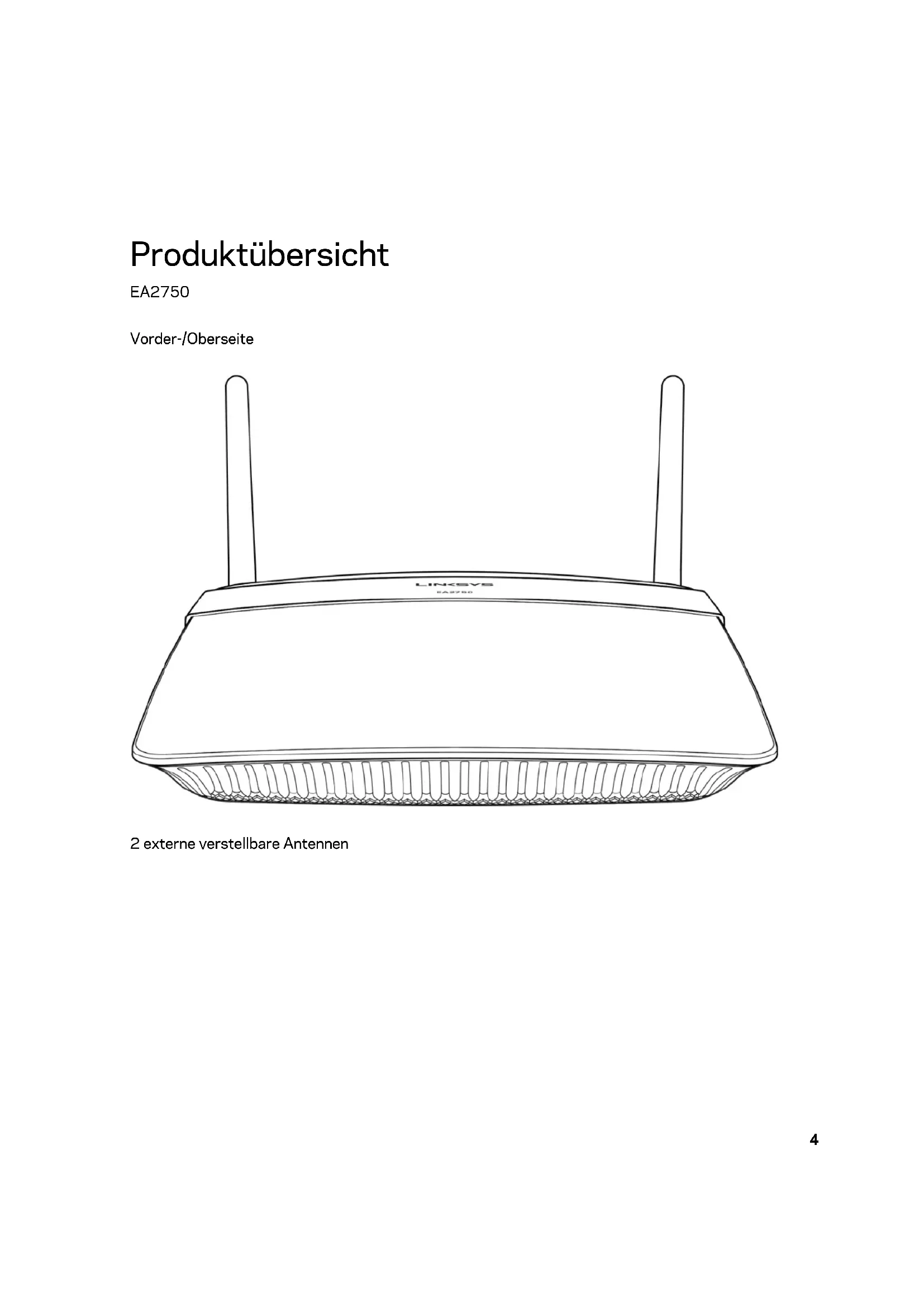 USB-2.0-Port – Schließen Sie ein USB-Laufwerk zur gemeinsamen Nutzung in Ihrem Netzwerk oder im Internet an.6 Unterseite Reset-Taste - -- Halten Sie die Taste gedrückt, bis die Betriebs-LED zu blinken beginnt, um den Router auf die Werkseinstellungen zurückzusetzen. Sie können die Werkseinstellungen auch wiederherstellen, indem Sie Linksys Smart Wi-Fi über einen Webbrowser aufrufen oder die mobile App Linksys Smart Wi-Fi verwenden.7 Einrichtung: Grundlagen Hier finden Sie weitere Unterstützung Neben diesem Benutzerhandbuch erhalten Sie Hilfe unter: Linksys.com/support/EA2750 (Dokumentation, Downloads, FAQs (häufig gestellte Fragen), technischer Support, Live-Chat, Foren) Linksys Smart Wi-Fi-Hilfe (stellen Sie eine Verbindung zu Linksys Smart Wi-Fi her, und klicken Sie dann oben im Bildschirm auf Help (Hilfe)) Ihren Router installieren Wenn Sie einen vorhandenen Router ersetzen, trennen Sie diesen zuerst. Drehen Sie die Antennen nach oben und schließen Sie den Router an eine Steckdose an. Verbinden Sie das Internetkabel am Modem mit dem gelben Internetport am Router. Warten Sie, bis die Leuchtanzeige auf der Vorderseite des Routers konstant leuchtet. Stellen Sie eine Verbindung mit dem sicheren Drahtlosnetzwerk her, das in der im Lieferumfang Ihres Routers enthaltenen Kurzanleitung angegeben wird. Sie können den Netzwerknamen und das Kennwort später ändern. Hinweis: Sie haben keinen Internetzugriff, bis die Routereinrichtung abgeschlossen ist. Öffnen Sie einen Webbrowser, um die Setup-Anleitung für den Linksys Smart Wi-Fi Router aufzurufen. Wenn die Anleitung nicht angezeigt wird, geben Sie linksyssmartwifi.com in die Adressleiste ein.8 Folgen Sie nach der Einrichtung den Anweisungen auf dem Bildschirm, um Ihr Linksys Smart Wi-Fi- Konto einzurichten. Mit Linksys Smart Wi-Fi können Sie Ihren Router von einem beliebigen Computer mit Internetverbindung aus konfigurieren. Sie können folgende Routereinstellungen vornehmen/ändern: