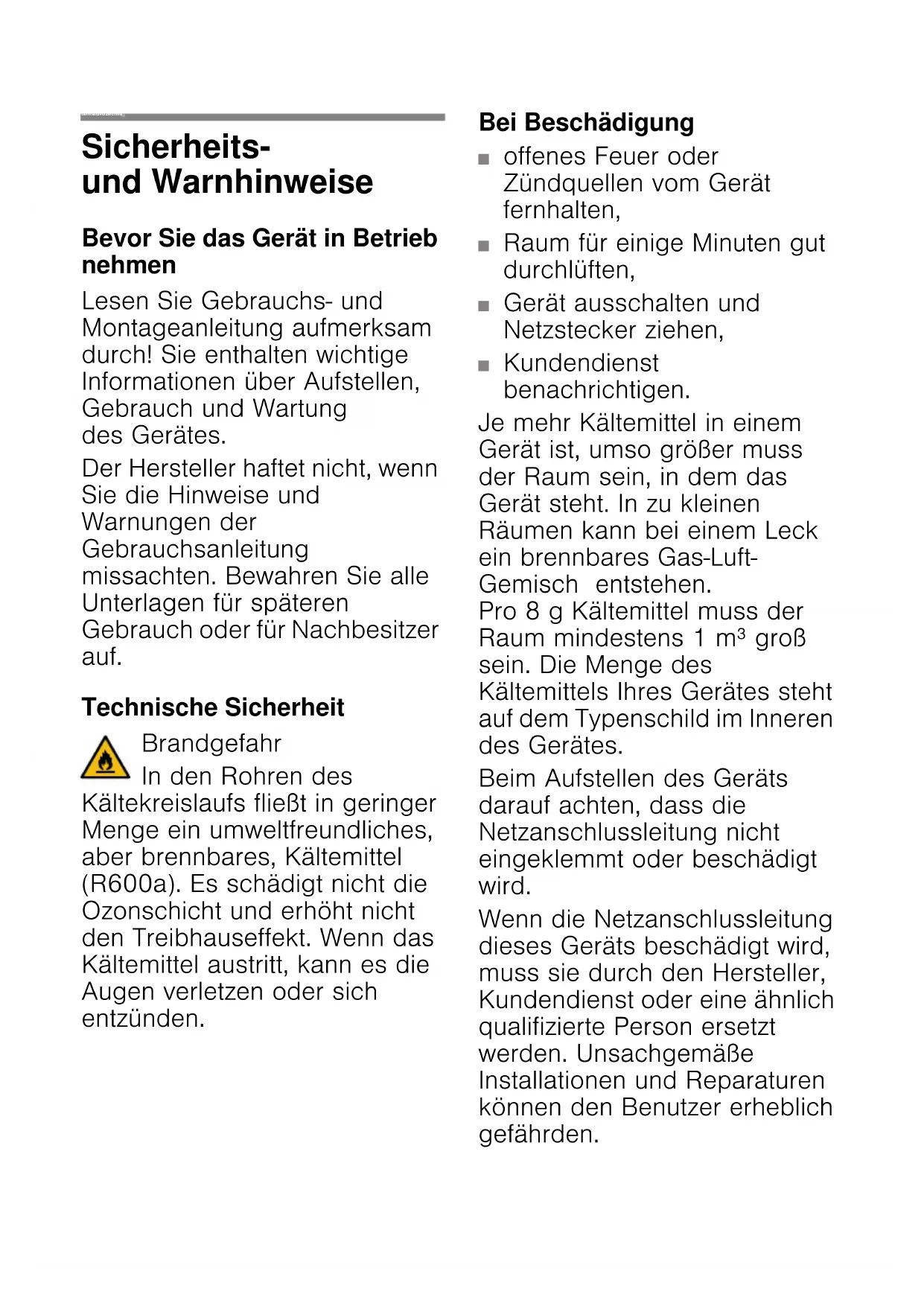 - Υπηρεσία εξυπηρέτησης πελατών deInhaltsverzeichnis deGebrauchsanleitung Sicherheits- und Warnhinweise Bevor Sie das Gerät in Betrieb nehmen Lesen Sie Gebrauchs- und Montageanleitung aufmerksam durch! Sie enthalten wichtige Informationen über Aufstellen, Gebrauch und Wartung des Gerätes. Der Hersteller haftet nicht, wenn Sie die Hinweise und Warnungen der Gebrauchsanleitung missachten. Bewahren Sie alle Unterlagen für späteren Gebrauch oder für Nachbesitzer auf. Technische Sicherheit Brandgefahr In den Rohren des Kältekreislaufs fließt in geringer Menge ein umweltfreundliches, aber brennbares, Kältemittel (R600a). Es schädigt nicht die Ozonschicht und erhöht nicht den Treibhauseffekt. Wenn das Kältemittel austritt, kann es die Augen verletzen oder sich entzünden. Bei Beschädigung ■ offenes Feuer oder Zündquellen vom Gerät fernhalten, ■ Raum für einige Minuten gut durchlüften, ■ Gerät ausschalten und Netzstecker ziehen, ■ Kundendienst benachrichtigen. Je mehr Kältemittel in einem Gerät ist, umso größer muss der Raum sein, in dem das Gerät steht. In zu kleinen Räumen kann bei einem Leck ein brennbares Gas-Luft- Gemisch entstehen. Pro 8 g Kältemittel muss der Raum mindestens 1 m³ groß sein. Die Menge des Kältemittels Ihres Gerätes steht auf dem Typenschild im Inneren des Gerätes. Beim Aufstellen des Geräts darauf achten, dass die Netzanschlussleitung nicht eingeklemmt oder beschädigt wird. Wenn die Netzanschlussleitung dieses Geräts beschädigt wird, muss sie durch den Hersteller, Kundendienst oder eine ähnlich qualifizierte Person ersetzt werden. Unsachgemäße Installationen und Reparaturen können den Benutzer erheblich gefährden.de p. 123