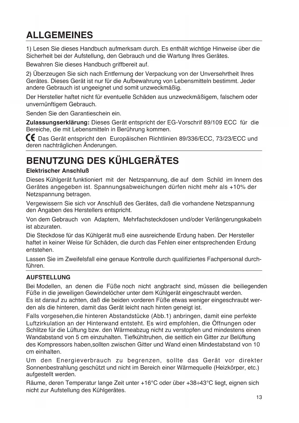 Elektrischer Anschluß Dieses Kühlgerät funktioniert mit der Netzspannung, die auf dem Schild im Innern des Gerätes angegeben ist. Spannungsabweichungen dürfen nicht mehr als +10% der Netzspannung betragen. Vergewissern Sie sich vor Anschluß des Gerätes, daß die vorhandene Netzspannung den Angaben des Herstellers entspricht. Von dem Gebrauch von Adaptern, Mehrfachsteckdosen und/oder Verlängerungskabeln ist abzuraten. Die Steckdose für das Kühlgerät muß eine ausreichende Erdung haben. Der Hersteller haftet in keiner Weise für Schäden, die durch das Fehlen einer entsprechenden Erdung entstehen. Lassen Sie im Zweifelsfall eine genaue Kontrolle durch qualifiziertes Fachpersonal durch- führen. AUFSTELLUNG Bei Modellen, an denen die Füße noch nicht angbracht sind, müssen die beiliegenden Füße in die jeweiligen Gewindelöcher unter dem Kühlgerät eingeschraubt werden. Es ist darauf zu achten, daß die beiden vorderen Füße etwas weniger eingeschraubt wer- den als die hinteren, damit das Gerät leicht nach hinten geneigt ist. Falls vorgesehen,die hinteren Abstandstücke (Abb.1) anbringen, damit eine perfekte Luftzirkulation an der Hinterwand entsteht. Es wird empfohlen, die Öffnungen oder Schlitze für die Lüftung bzw. den Wärmeabzug nicht zu verstopfen und mindestens einen Wandabstand von 5 cm einzuhalten. Tiefkühltruhen, die seitlich ein Gitter zur Belüftung des Kompressors haben,sollten zwischen Gitter und Wand einen Mindestabstand von 10 cm einhalten. Um den Energieverbrauch zu begrenzen, sollte das Gerät vor direkter Sonnenbestrahlung geschützt und nicht im Bereich einer Wärmequelle (Heizkörper, etc.) aufgestellt werden. Räume, deren Temperatur lange Zeit unter +16°C oder über +38÷43°C liegt, eignen sich nicht zur Aufstellung des Kühlgerätes.Achten Sie darauf, daß eine ausreichende Luftzirkulation gewährleistet ist. Der Hersteller haftet nicht für Fehler, die aus fehlerhafter Aufstellung resultieren. HINWEISE ZUR KORREKTEN UND HYGIENISCHEN EINLAGERUNG VON LEBENS- MITTELN Der korrekte Gebrauch des Kühlschrankes und die Beachtung einiger einfacher Regeln bei der Lagerung von Lebensmitteln leisten einen wesentlichen Beitrag zur besseren Aufbewahrung des Kühlgutes. Hinweise zur korrekten Einlagerung Leicht verderbliche Speisen sollten im kältesten Bereich des Kühlschrankes (in der Regel unten, direkt über den Gemüseschalen) gelagert werden. Bereits gegartes, noch warmes Kühlgut sollte in luftdichte Behälter eingefüllt und erst nach Abkühlung in den mittleren Bereich des Kühlschrankes eingelagert werden. Obst und Gemüse sind in den dafür vergesehenen Gemüseschalen im unteren Bereich des Kühlschrankes aufzubewahren. Hinweise zur hygieneschen Aufbewahrung Entfernen Sie die Umverpackung der Lebensmittel, bevor Sie diese in den Kühlschrank einlagern. Frische Lebensmittel sollten vor Einlagerung in Folie eingewickelt werden, damit sie län- ger frisch bleiben und eine Geruchsbildung vermieden wird. Lagern Sie die Lebensmittel so ein, daß die Luftzirkulation im Inneren des Kühlschrankes gewährleistet ist. Reinigen Sie den Kühlschrankinnenraum in regelmäßigen Abständen. Benutzen Sie hier- zu einen umweltfreundlichen milden Haushaltsreiniger. Zur Beseitigung eventueller Gerüche und Bakterien können Sie Essigwasser benutzen.