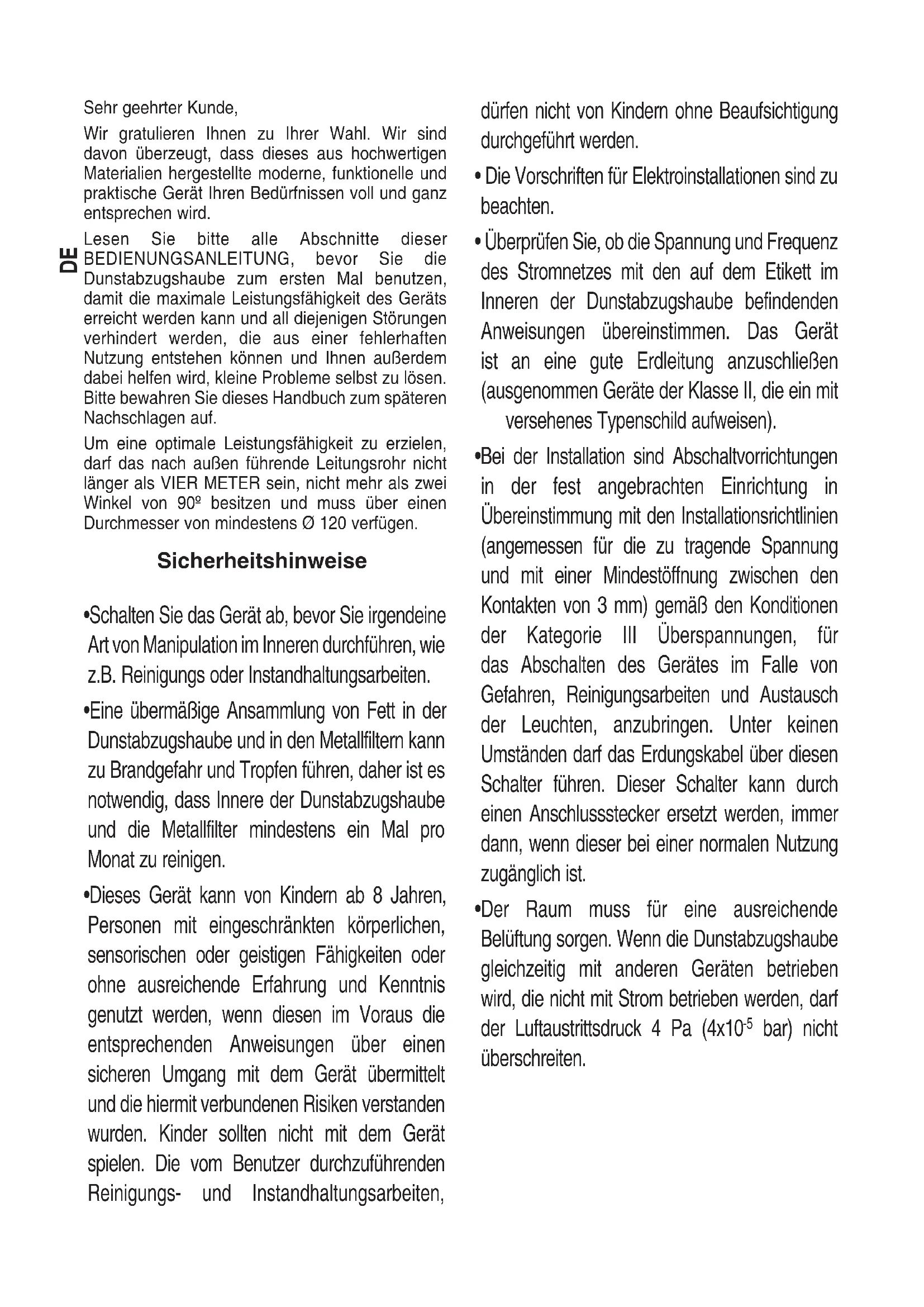 - És possible que amb la instal·lació de filtres de carbó s’observi a la campana una reducció de cabal d’extracció.DE Sehr geehrter Kunde, Wir gratulieren Ihnen zu Ihrer Wahl. Wir sind davon überzeugt, dass dieses aus hochwertigen Materialien hergestellte moderne, funktionelle und praktische Gerät Ihren Bedürfnissen voll und ganz entsprechen wird. Lesen Sie bitte alle Abschnitte dieser BEDIENUNGSANLEITUNG, bevor Sie die Dunstabzugshaube zum ersten Mal benutzen, damit die maximale Leistungsfähigkeit des Geräts erreicht werden kann und all diejenigen Störungen verhindert werden, die aus einer fehlerhaften Nutzung entstehen können und Ihnen außerdem dabei helfen wird, kleine Probleme selbst zu lösen. Bitte bewahren Sie dieses Handbuch zum späteren Nachschlagen auf. Um eine optimale Leistungsfähigkeit zu erzielen, darf das nach außen führende Leitungsrohr nicht länger als VIER METER sein, nicht mehr als zwei Winkel von 90º besitzen und muss über einen Durchmesser von mindestens Ø 120 verfügen.