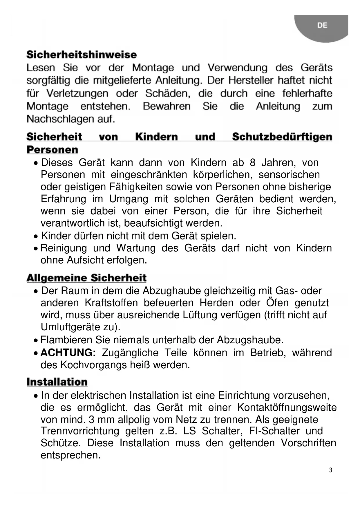 Перед установкой и эксплуатацией прибора внимательно ознакомьтесь с приложенным руководством.3 Dieses Gerät kann dann von Kindern ab 8 Jahren, von Personen mit eingeschränkten körperlichen, sensorischen oder geistigen Fähigkeiten sowie von Personen ohne bisherige Erfahrung im Umgang mit solchen Geräten bedient werden, wenn sie dabei von einer Person, die für ihre Sicherheit verantwortlich ist, beaufsichtigt werden. Kinder dürfen nicht mit dem Gerät spielen. Reinigung und Wartung des Geräts darf nicht von Kindern ohne Aufsicht erfolgen. Der Raum in dem die Abzughaube gleichzeitig mit Gas- oder anderen Kraftstoffen befeuerten Herden oder Öfen genutzt wird, muss über ausreichende Lüftung verfügen (trifft nicht auf Umluftgeräte zu). Flambieren Sie niemals unterhalb der Abzugshaube. ACHTUNG: Zugängliche Teile können im Betrieb, während des Kochvorgangs heiß werden. In der elektrischen Installation ist eine Einrichtung vorzusehen, die es ermöglicht, das Gerät mit einer Kontaktöffnungsweite von mind. 3 mm allpolig vom Netz zu trennen. Als geeignete Trennvorrichtung gelten z.B. LS Schalter, FI-Schalter und Schütze. Diese Installation muss den geltenden Vorschriften entsprechen.4 Wenn die elektrische Verbindung über einen Netzstecker erhalten bleibt und dieser nach der Montage zugänglich ist, dann ist es nicht erforderlich, die genannte Vorrichtung bereitzustellen. Die Luft darf nicht in einen Schornsteinzug geleitet werden, der Abgase von mit Gas oder anderen Kraftstoffen befeuerten Geräten ableitet (trifft nicht auf Umluftgeräte zu). Die Unterseite der Dunstabzugshaube muß eine Mindesthöhe von 65 cm Über Gaskochstellen aufweisen. Ist in den Einbauanweisungen für ein Gaskochfeld ein größerer Abstand angegeben, muß dieser entsprechend berücksichtigt werden. Informieren Sie sich vor Einbau der Dunstabzugshaube über die jeweils geltenden örtlichen Vorschriften über Luft- und Rauchabzug. Bei gleichzeitigem Betrieb Dunstabzugshaube im Abluftbetrieb und Feuerstätten darf im Aufstellraum der Feuerstätte der Unterdruck nicht größer als 4 Pa (4x10 bar) sein. Prüfen Sie vor Anschluß der Dunstabzugshaube an das Netz, ob Frequenz und Spannung mit den Angaben auf dem Typenschild übereinstimmen. Um eine optimale Leistung der Dunstab-zugshaube zu erreichen, darf die Länge des Abzugsrohrs VIER Meter nicht überschreiten und sollte nicht mehr als zwei 90°-Winkel enthalten. Obwohl eine Absaugung der beim Kochen entstehenden Dämpfe nach außen empfohlen wird, können Aktivkohlefilter ein-gebaut werden, die eine Rückführung der gereinigten Gase in die Küche über das Abzugsrohr ermöglichen. NOTE: Weitere Informationen finden Sie am Ende dieser Bedienungsanleitung. Ein Nichtbefolgen der Reinigungsvorschriften kann zu Bränden führen.5 Vermeiden Sie Fettablagerungen auf allen Teilen der Dunstabzugshaube und insbesondere im Filter, es besteht Brandgefahr. In Abhängigkeit vom Grad der Nutzung der Dunstabzugshaube ist eine Reinigung der Filter mindestens einmal monatlich erforderlich. Beachten Sie bitte, daß beim Kochen auch dann Fettablagerungen an der Dunstabzugshaube und im Filter auftreten, wenn diese nicht in Betrieb ist. Wir empfehlen Ihnen, bei der Reinigung Schutzhandschuhe zu tragen und bei der Reinigung des Inneren der Dunstabzugshaube mit größter Vorsicht vorzugehen. Benutzen Sie die Dunstabzugshaube nicht mit defektem oder angeschnittenem Netzkabel, oder wenn das Gerät sichtbare Schäden im Bereich der Bedienelemente aufweist. Falls das Netzkabel beschädigt wird, ist es vom Hersteller, von autorisierten Vertretern oder von für diese Aufgabe qualifizierten Technikern zu ersetzen, um gefährliche Situationen zu vermeiden. Bei Fehlfunktion der LED, muss diese vom Hersteller, dem Verkäufer oder einem qualifizierten Servicebetrieb ersetzt werden, um Gefahren zu vermeiden. Wenn die Dunstabzugshaube nicht mehr oder nicht mehr richtig funktioniert, trennen Sie diese vom Netz und setzen Sie sich mit dem technischen Kundendienst in Verbindung. Hinsichtlich aller Reparaturarbeiten wenden Sie sich bitte an die nächstgelegene Kundendienststelle, die eine Verwendung von Originalersatzteilen garantiert. Alle Reparaturen oder Eingriffe durch andere Personen können Schäden und Funktionsstörungen am Gerät hervorrufen und Gefahren für Ihre Sicherheit zur Folge haben.67