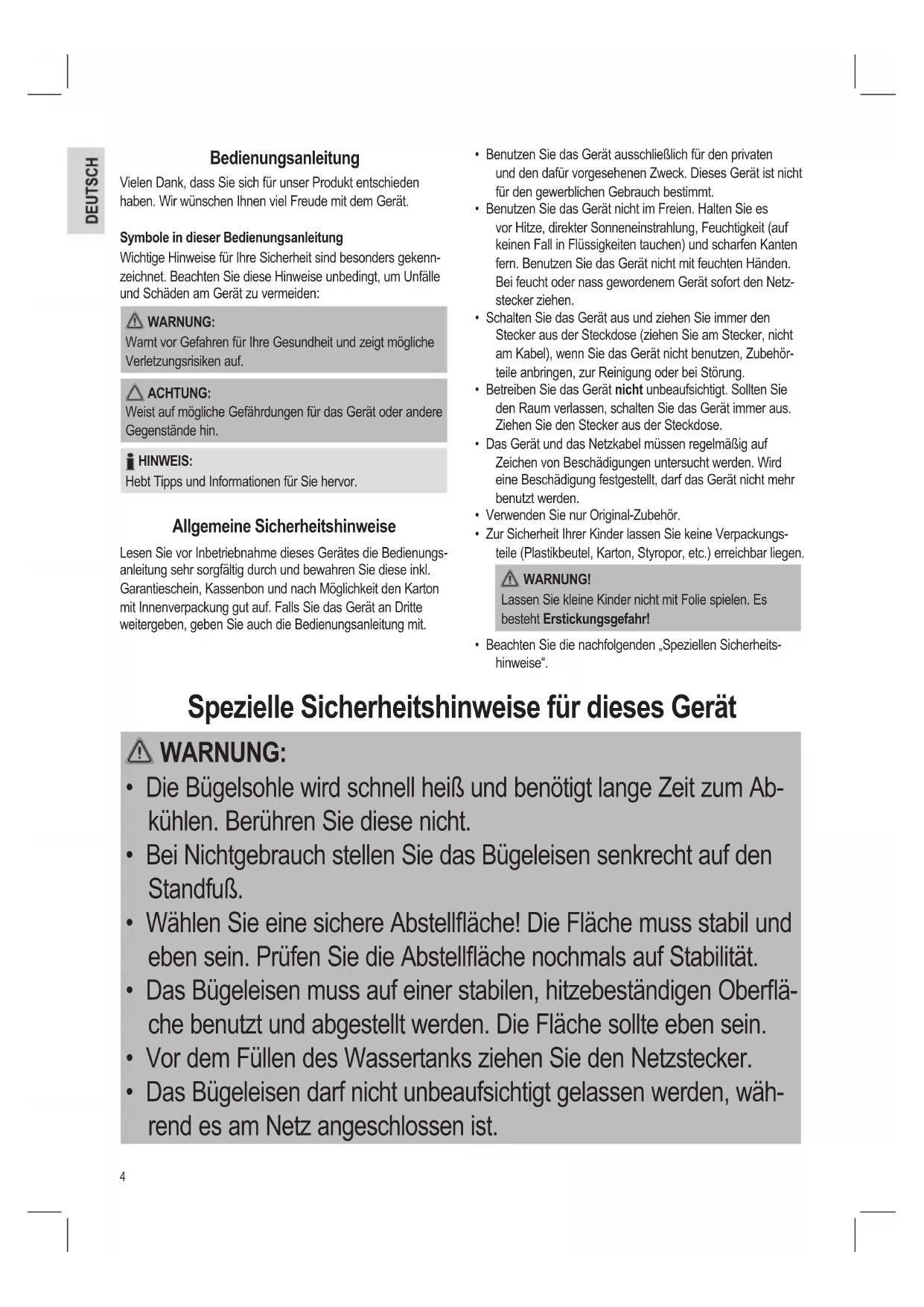 - Das Bügeleisen darf nicht unbeaufsichtigt gelassen werden, wäh- rend es am Netz angeschlossen ist.5 WARNUNG: