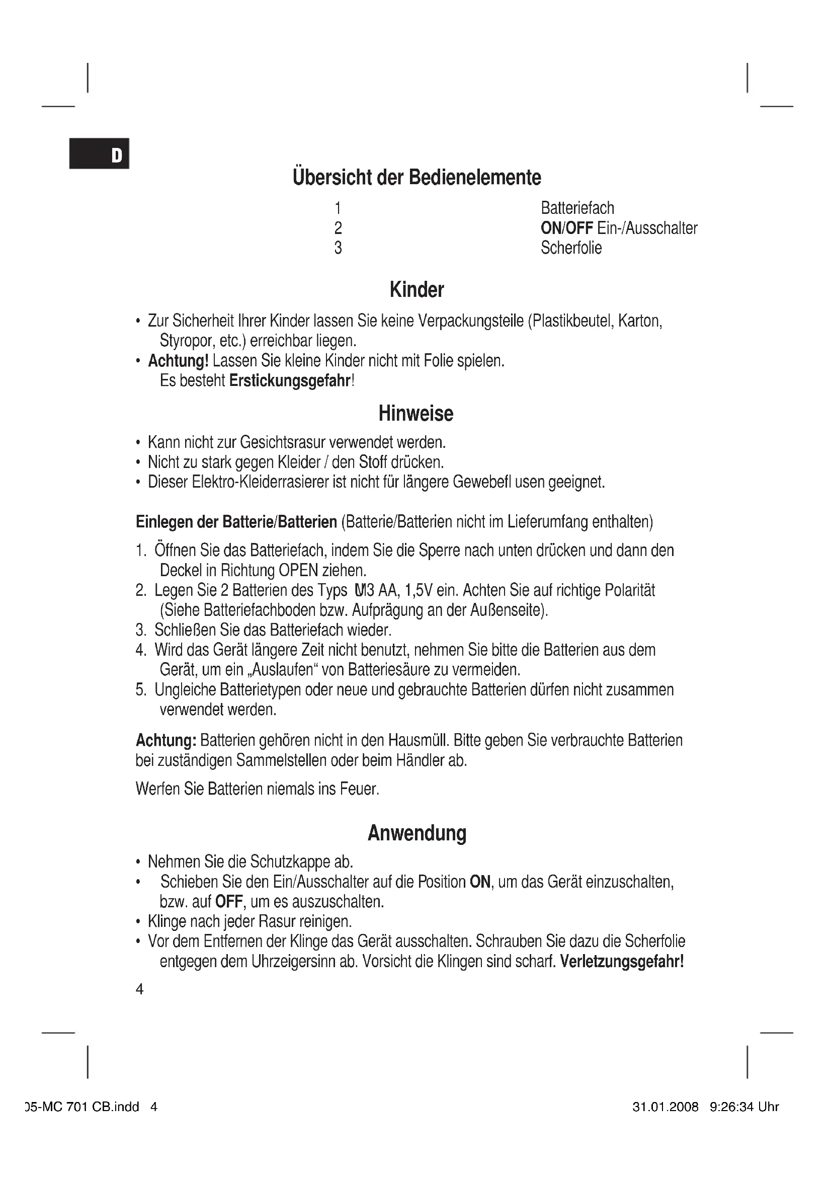 - Vor dem Entfernen der Klinge das Gerät ausschalten. Schrauben Sie dazu die Scherfolie entgegen dem Uhrzeigersinn ab. Vorsicht die Klingen sind scharf. Verletzungsgefahr! 05-MC 701 CB.indd 405-MC 701 CB.indd 4 31.01.2008 9:26:34 Uhr31.01.2008 9:26:34 Uhr