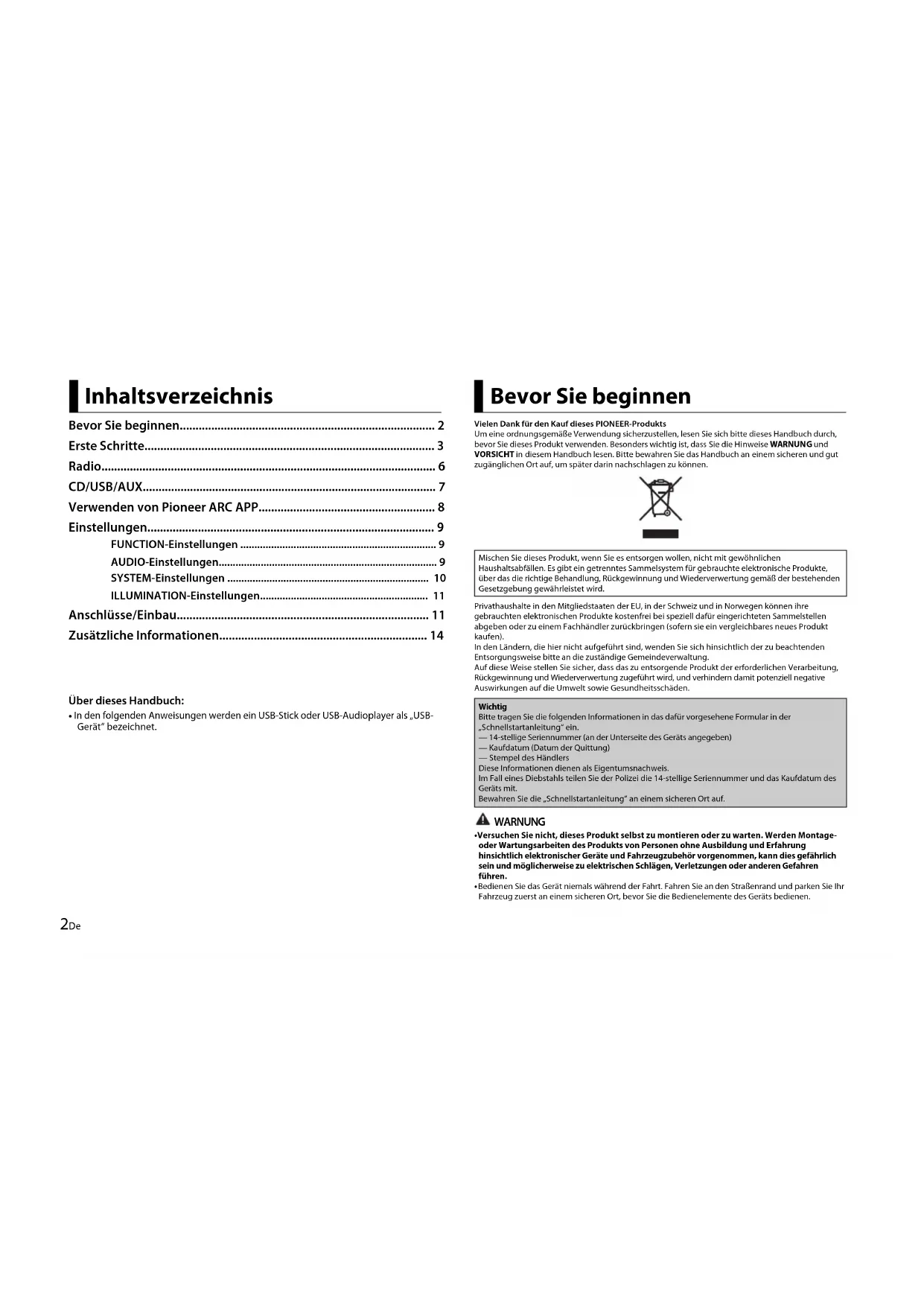 - In den folgenden Anweisungen werden ein USB-Stick oder USB-Audioplayer als „USB- Gerät” bezeichnet. Inhaltsverzeichnis Vielen Dank für den Kauf dieses PIONEER-ProduktsUm eine ordnungsgemäße Verwendung sicherzustellen, lesen Sie sich bitte dieses Handbuch durch, bevor Sie dieses Produkt verwenden. Besonders wichtig ist, dass Sie die Hinweise WARNUNG und VORSICHT in diesem Handbuch lesen. Bitte bewahren Sie das Handbuch an einem sicheren und gut zugänglichen Ort auf, um später darin nachschlagen zu können.Privathaushalte in den Mitgliedstaaten der EU, in der Schweiz und in Norwegen können ihre gebrauchten elektronischen Produkte kostenfrei bei speziell dafür eingerichteten Sammelstellen abgeben oder zu einem Fachhändler zurückbringen (sofern sie ein vergleichbares neues Produkt kaufen).In den Ländern, die hier nicht aufgeführt sind, wenden Sie sich hinsichtlich der zu beachtenden Entsorgungsweise bitte an die zuständige Gemeindeverwaltung.Auf diese Weise stellen Sie sicher, dass das zu entsorgende Produkt der erforderlichen Verarbeitung, Rückgewinnung und Wiederverwertung zugeführt wird, und verhindern damit potenziell negative Auswirkungen auf die Umwelt sowie Gesundheitsschäden. WARNUNG