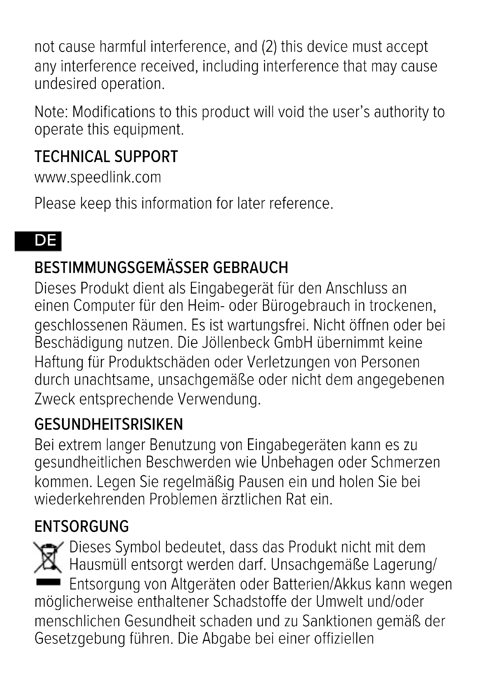 Sammelstelle ist kostenlos und gesetzlich vorgeschrieben, stellt die korrekte Entsorgung oder Verwertung/ Wiederverwendung sicher und leistet einen Beitrag zum Umweltschutz. Auskunft erteilen Behörden, Wertstohöfe oder Fachgeschäfte. Große Händler (Elektrogeräte- Verkaufsfläche ≥ 400 m²) nehmen Kleingeräte (alle Maße < 25 cm) kostenlos an, andere nur bei Kauf gleichwertiger Produkte. Batterien/Akkus möglichst entnehmen. KONFORMITÄTSHINWEIS Unter Einwirkung von starken statischen, elektrischen oder hochfrequenten Feldern (Funkanlagen, Mobiltelefonen, Mikrowellen-Entladungen) kann es zu Funktionsbeeinträchtigungen des Gerätes (der Geräte) kommen. Versuchen Sie in diesem Fall, die Distanz zu den störenden Geräten zu vergrößern. TECHNISCHER SUPPORT www.speedlink.com Bitte bewahren Sie diese Information zur künftigen Verwendung auf.