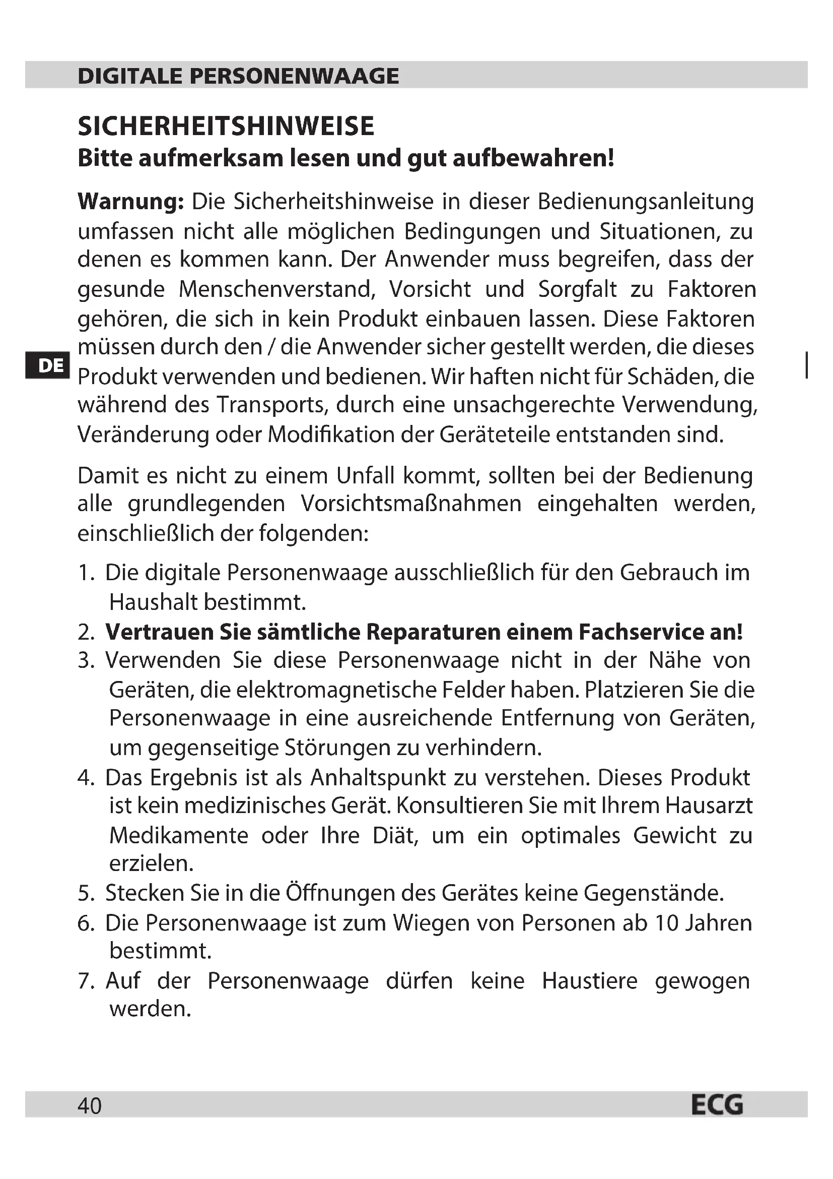 - Die digitale Personenwaage ausschließlich für den Gebrauch im Haushalt bestimmt.