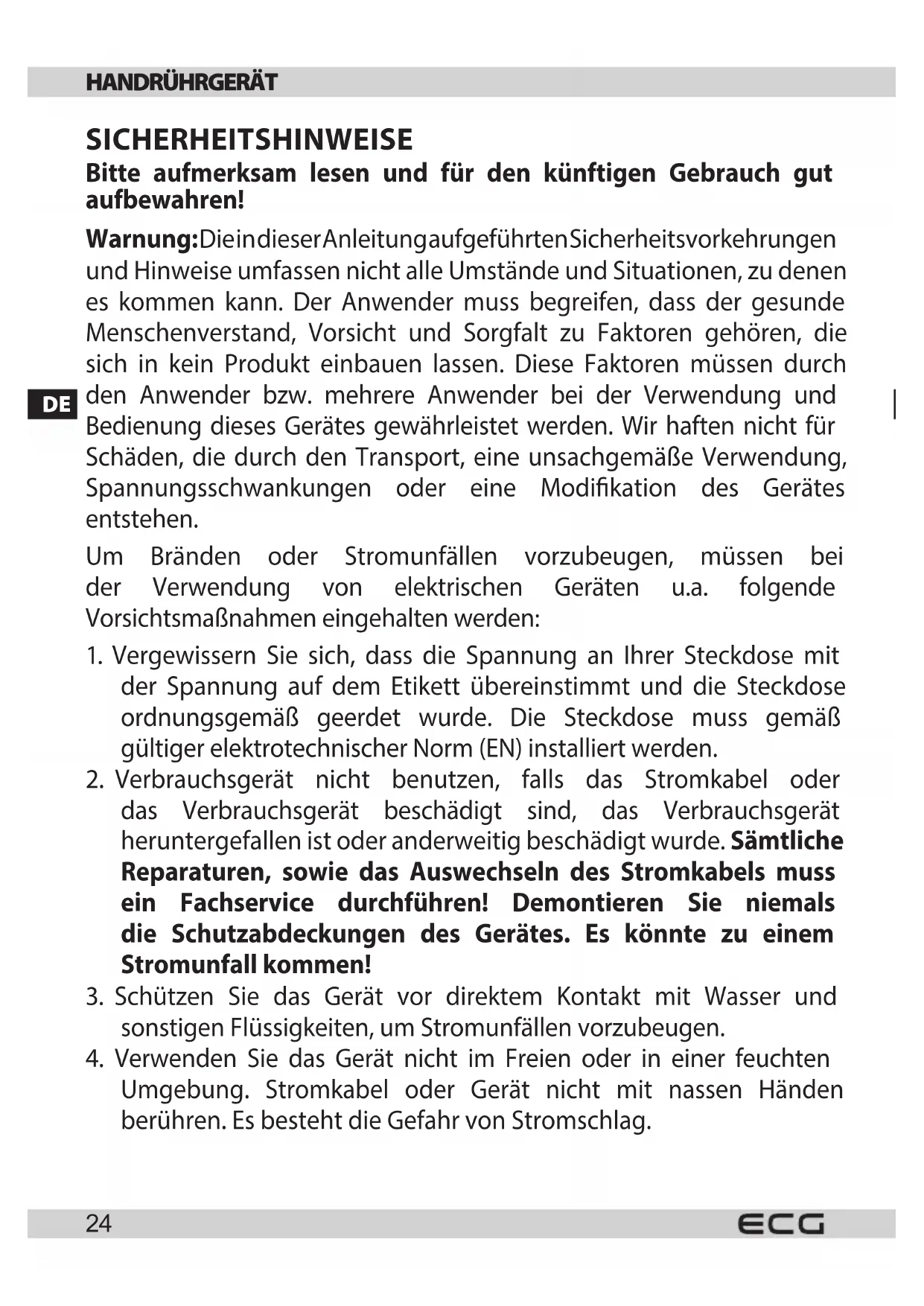 Verpackungspapier und Wellpappe – zum Altpapier geben. Verpackungsfolie, PET-Beutel, Plastikteile – in den Sammelcontainer für Plastik. ENTSORGUNG DES PRODUKTES NACH ABLAUF DER LEBENSDAUER Die Entsorgung der verwendeten elektrischen und elektronischen Geräte (gültig in den Mitgliedsländern der EU und weiteren europäischen Ländern mit dem eingeführten System der Abfalltrennung) Das abgebildete Symbol auf dem Produkt oder auf der Verpackung bedeutet, dass das Produkt nicht als Hausmüll abgegeben werden soll. Das Produkt geben Sie an einem Ort ab, der für das Recycling von elektrischen und elektronischen Geräten bestimmt ist. Die richtige Entsorgung des Produktes schützt Sie vor negativen Einüssen auf die menschliche Gesundheit und des Lebensraumes. Das Recycling des Materials trägt zum Schutz der Naturressourcen bei. Mehr Informationen über das Recycling dieses Produktes gibt Ihnen die Kommunalbehörde, Organisationen für die Bearbeitung von Hausabfall oder die Verkaufsstelle, in der Sie das Produkt erworben haben. Dieses Produkt erfüllt die Anforderung der EU-Richtlinien über elektromagnetische Kompatibilität und elektrische Sicherheit. Bedienungsanleitung s. www.ecg-electro.eu. Eine Änderung des Textes und der technischen Parameter vorbehalten. 08/05HAND MIXER