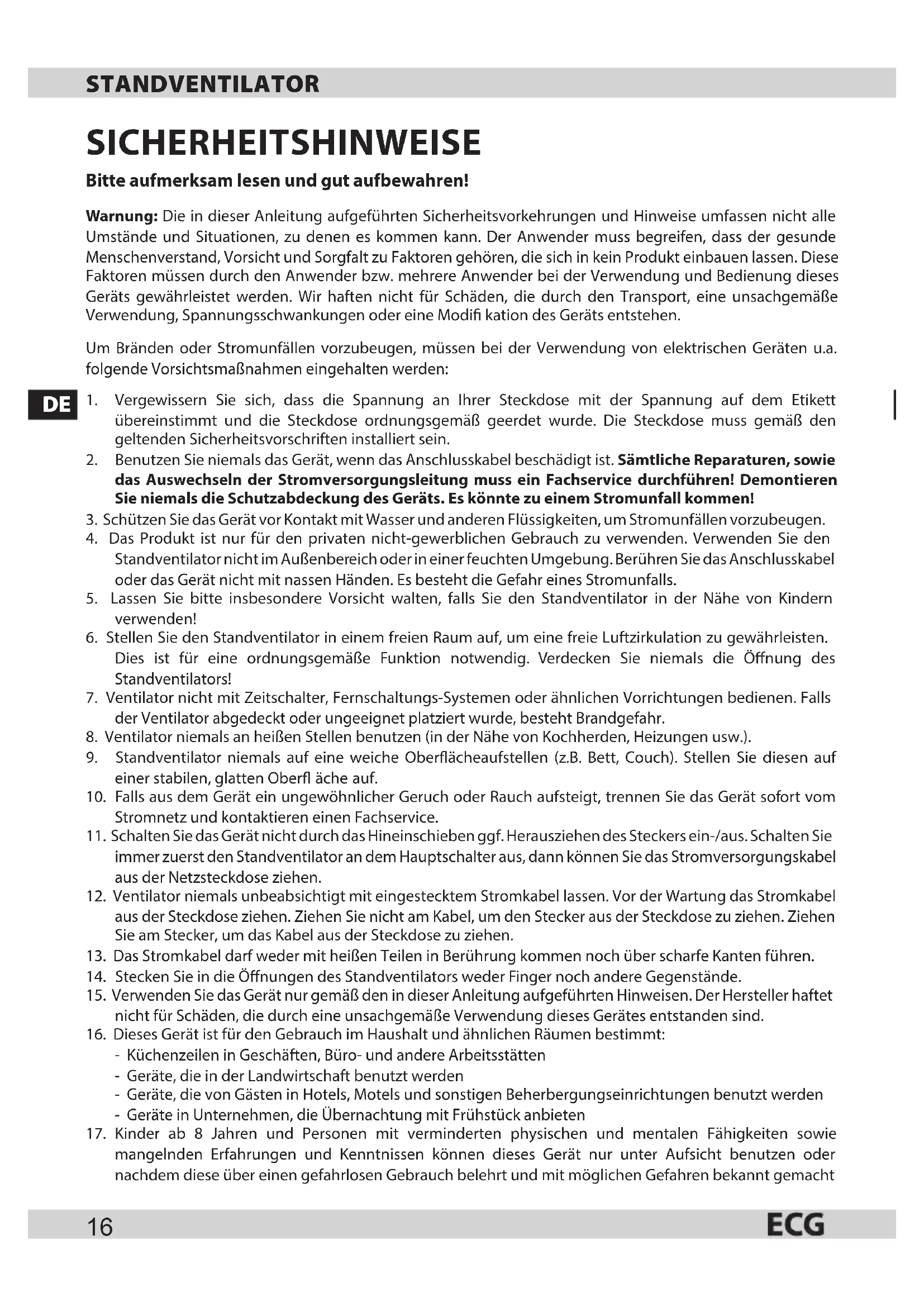 16. Dieses Gerät ist für den Gebrauch im Haushalt und ähnlichen Räumen bestimmt:
