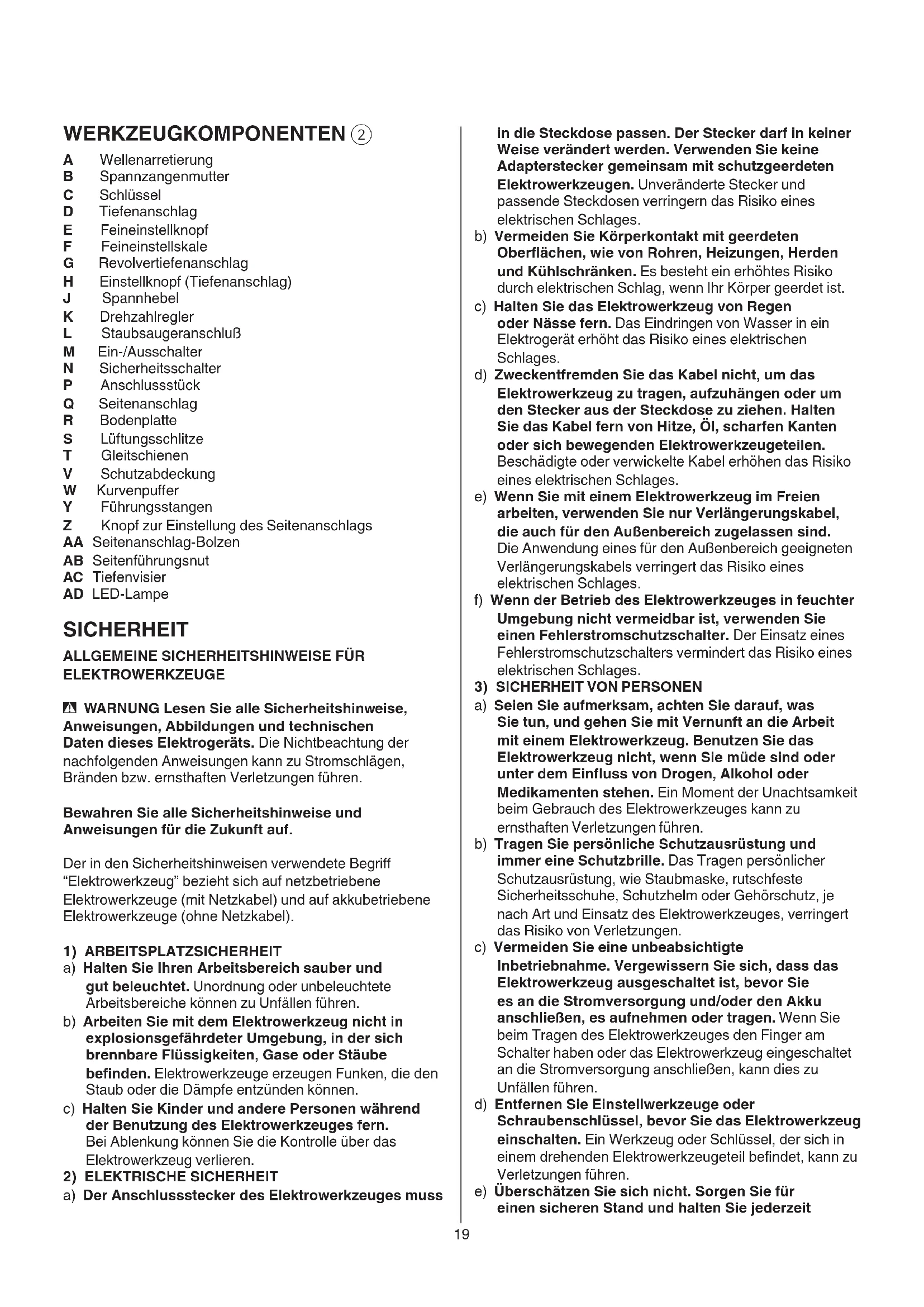 - Das Werkzeug ist bestimmt zum Fräsen von Nuten, Kanten, Profile und Langlocher in Holz, Kunststoff und Leichtbaustoffen sowie zum Kopierfräsen