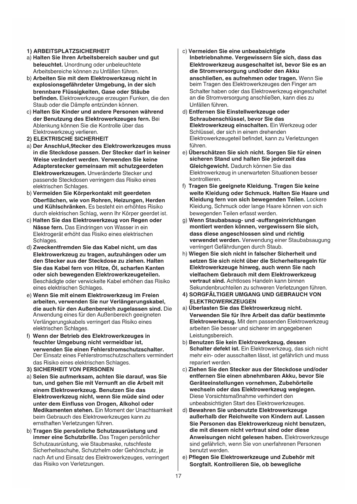 ELEKTROWERKZEUGE WARNUNG Lesen Sie alle Sicherheitshinweise, Anweisungen, Bebilderungen und technischen Daten, mit denen dieses Elektrowerkzeug versehen ist. Versäumnisse bei der Einhaltung der nachfolgenden Anweisungen können elektrischen Schlag, Brand und/oder schwere Verletzungen verursachen. Bewahren Sie alle Sicherheitshinweise und Anweisungen für die Zukunft auf. Der in den Sicherheitshinweisen verwendete Begriff “Elektrowerkzeug” bezieht sich auf netzbetriebene Elektrowerkzeuge (mit Netzkabel) und auf akkubetriebene Elektrowerkzeuge (ohne Netzkabel).17