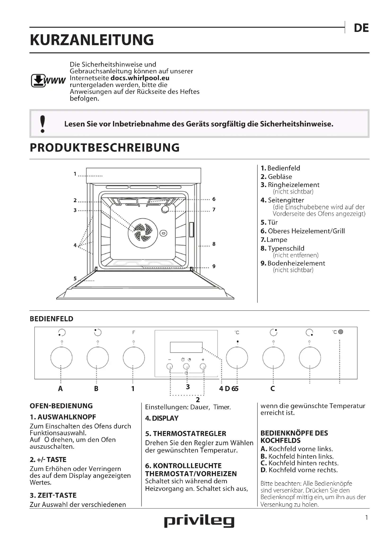 KOCHFELDS A. Kochfeld vorne links.B. Kochfeld hinten links.C. Kochfeld hinten rechts.D. Kochfeld vorne rechts.Bitte beachten: Alle Bedienknöpfe sind versenkbar. Drücken Sie den Bedienknopf mittig ein, um ihn aus der Versenkung zu holen. KURZANLEITUNG Lesen Sie vor Inbetriebnahme des Geräts sorgfältig die Sicherheitshinweise. WWW Die Sicherheitshinweise und Gebrauchsanleitung können auf unserer Internetseite docs.whirlpool.eu runtergeladen werden, bitte die Anweisungen auf der Rückseite des Heftes befolgen.