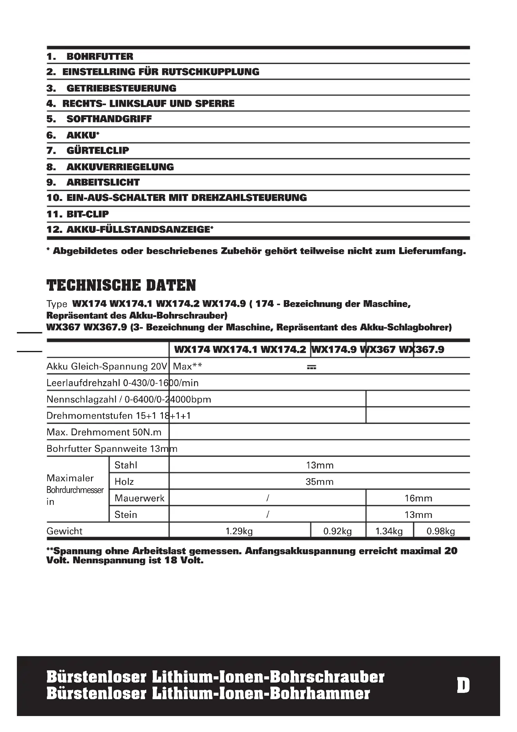 HINWEIS: Lesen Sie das Handbuch vor Inbetriebnahme des Werkzeuges sorgfältig durch. BESTIMMUNGSGEMÄSSER GEBRAUCH(FÜR WX174 WX174.1 WX174.2 WX174.9) Das Gerät ist bestimmt zum Eindrehen und Lösen von Schrauben sowie zum Bohren in Holz, Metall und Kunststoff. BESTIMMUNGSGEMÄSSER GEBRAUCH(FÜR WX367 WX367.9) Das Gerät ist bestimmt zum Schlagbohren in Ziegel, Beton und Gestein, sowie zum Bohren in Holz, Metall, Keramik und Kunststoff.