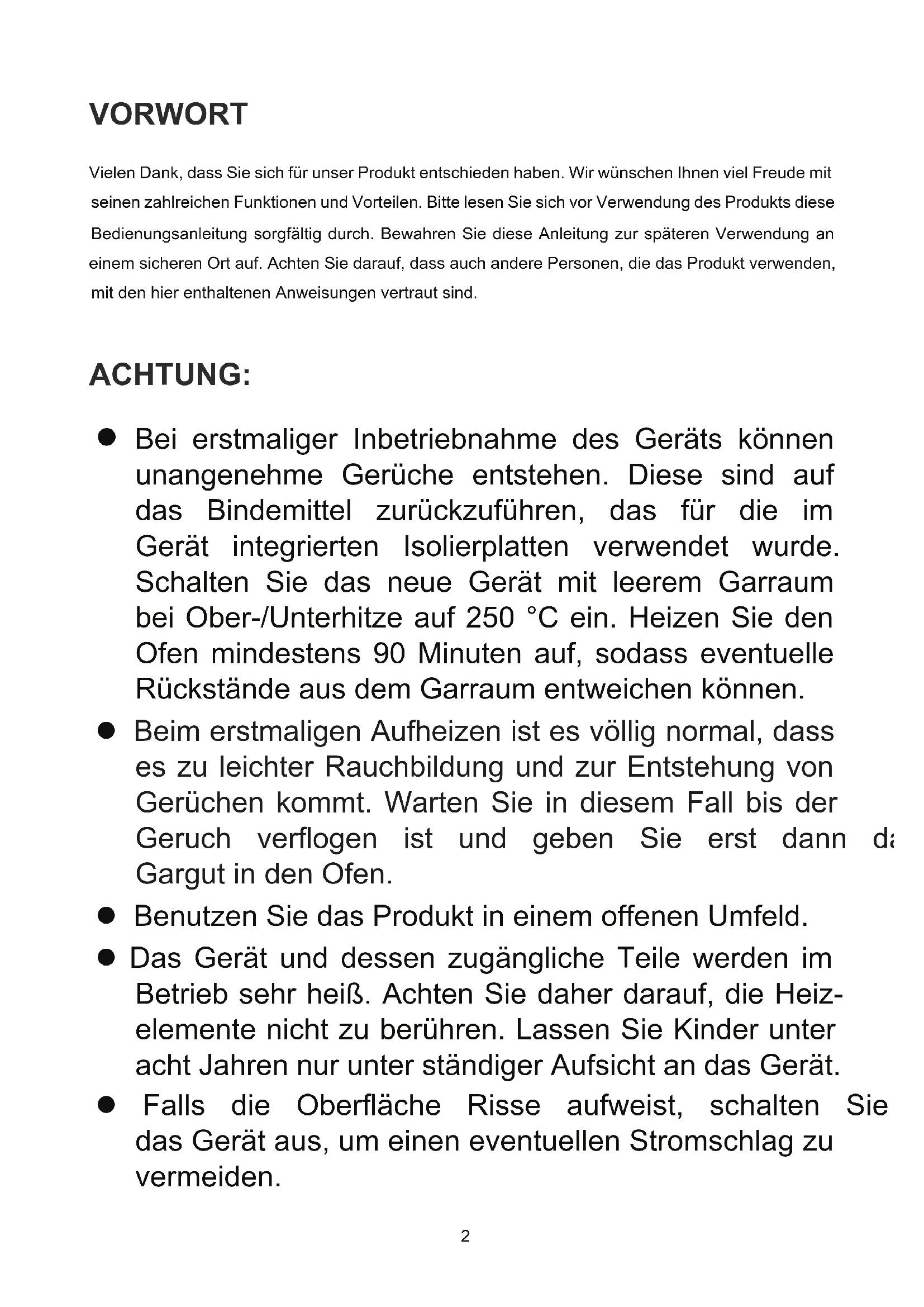 Bei erstmaliger Inbetriebnahme des Geräts können unangenehme Gerüche entstehen. Diese sind auf das Bindemittel zurückzuführen, das für die im Gerät integrierten Isolierplatten verwendet wurde. Schalten Sie das neue Gerät mit leerem Garraum bei Ober-/Unterhitze auf 250 °C ein. Heizen Sie den Ofen mindestens 90 Minuten auf, sodass eventuelle Rückstände aus dem Garraum entweichen können. Beim erstmaligen Aufheizen ist es völlig normal, dass es zu leichter Rauchbildung und zur Entstehung von Gerüchen kommt. Warten Sie in diesem Fall bis der Geruch verogen ist und geben Sie erst dann das Gargut in den Ofen. Benutzen Sie das Produkt in einem offenen Umfeld. Das Gerät und dessen zugängliche Teile werden im Betrieb sehr heiß. Achten Sie daher darauf, die Heiz- elemente nicht zu berühren. Lassen Sie Kinder unter acht Jahren nur unter ständiger Aufsicht an das Gerät. Falls die Oberäche Risse aufweist, schalten Sie das Gerät aus, um einen eventuellen Stromschlag zu vermeiden.3 Das Gerät kann von Kindern ab acht Jahren sowie Personen mit eingeschränkten physischen, sensorischen oder mentalen Fähigkeiten oder auch Mangel an Erfahrung und Wissen verwendet werden, wenn diese dabei beaufsichtigt werden oder in der sicheren Verwendung des Geräts angeleitet worden sind und die mit der Verwendung einhergehenden Gefahren verstanden haben. Das Gerät ist kein Kinderspielzeug. Reinigung und Pege dürfen von Kindern nur unter Aufsicht durchgeführt werden. Das Gerät wird im Betrieb sehr heiß. Achten Sie daher darauf, die Heizelemente im Ofeninnenraum nicht zu berühren. Halten Sie Kinder während des Betriebs vom Ofen fern, insbesondere bei eingeschaltetem Grill. Vor einem Austausch der Backofenlampe das Gerät ausschalten, um einem möglichen Stromschlag vorzubeugen. Die Trennvorrichtungen müssen nach den Verdraht- ungsregeln in die festverlegte elektrische Installation integriert werden. Das Gerät ist kein Spielzeug. Daher sind Kinder fernzuhalten. Das Gerät darf von Personen (einschließlich Kindern) mit eingeschränkten physischen, sensorischen oder mentalen Fähigkeiten oder auch Mangel an Erfahrung und Wissen verwendet werden, wenn diese von einer für deren Sicherheit verantwortlichen Person dabei beaufsichtigt werden oder in der sicheren Verwendung4 des Geräts angeleitet worden sind. Die zugänglichen Teile des Geräts können im Betrieb heiß werden. Kleinkinder sind daher vom Gerät fernzuhalten. Eine allpolige Trennvorrichtung muss nach den Verdrahtungsregeln in die festverlegte elektrische Installation integriert werden.