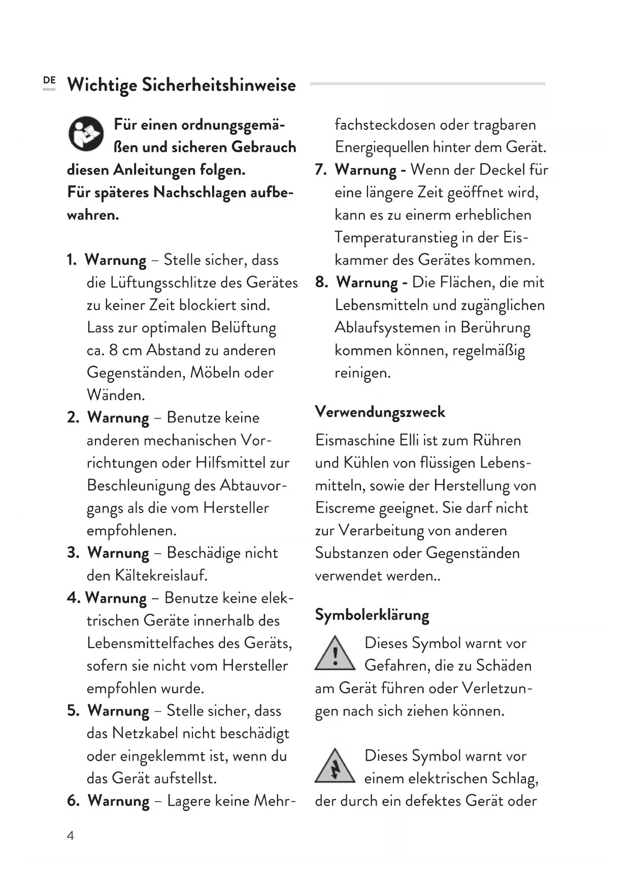 Eismaschine Elli ist zum Rühren und Kühlen von flüssigen Lebensmitteln, sowie der Herstellung von Eiscreme geeignet. Sie darf nicht zur Verarbeitung von anderen Substanzen oder Gegenständen verwendet werden..