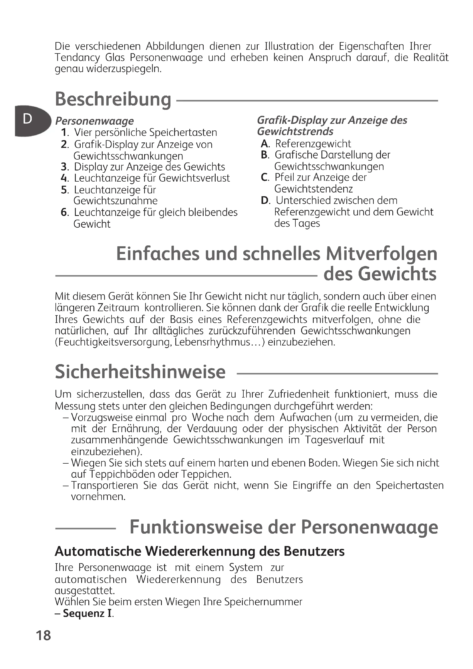 Die verschiedenen Abbildungen dienen zur Illustration der Eigenschaften IhrerTendancy Glas Personenwaage und erheben keinen Anspruch darauf, die Realitätgenau widerzuspiegeln. Beschreibung Personenwaage1. Vier persönliche Speichertasten2. Grafik-Display zur Anzeige von Gewichtsschwankungen3. Display zur Anzeige des Gewichts4. Leuchtanzeige für Gewichtsverlust5. Leuchtanzeige für Gewichtszunahme6. Leuchtanzeige für gleich bleibendes Gewicht Einfaches und schnelles Mitverfolgen des Gewichts Mit diesem Gerät können Sie Ihr Gewicht nicht nur täglich, sondern auch über einenlängeren Zeitraum kontrollieren. Sie können dank der Grafik die reelle EntwicklungIhres Gewichts auf der Basis eines Referenzgewichts mitverfolgen, ohne dienatürlichen, auf Ihr alltägliches zurückzuführenden Gewichtsschwankungen(Feuchtigkeitsversorgung, Lebensrhythmus…) einzubeziehen. Sicherheitshinweise Um sicherzustellen, dass das Gerät zu Ihrer Zufriedenheit funktioniert, muss die Messung stets unter den gleichen Bedingungen durchgeführt werden: – Vorzugsweise einmal pro Woche nach dem Aufwachen (um zu vermeiden, die mit der Ernährung, der Verdauung oder der physischen Aktivität der Person zusammenhängende Gewichtsschwankungen im Tagesverlauf miteinzubeziehen).– Wiegen Sie sich stets auf einem harten und ebenen Boden. Wiegen Sie sich nichtauf Teppichböden oder Teppichen.– Transportieren Sie das Gerät nicht, wenn Sie Eingriffe an den Speichertastenvornehmen. Funktionsweise der Personenwaage Automatische Wiedererkennung des Benutzers Ihre Personenwaage ist mit einem System zur automatischen Wiedererkennung des Benutzers ausgestattet.Wählen Sie beim ersten Wiegen Ihre Speichernummer– Sequenz I.Grafik-Display zur Anzeige desGewichtstrendsA. ReferenzgewichtB. Grafische Darstellung derGewichtsschwankungenC. Pfeil zur Anzeige derGewichtstendenzD. Unterschied zwischen demReferenzgewicht und dem Gewichtdes TagesF