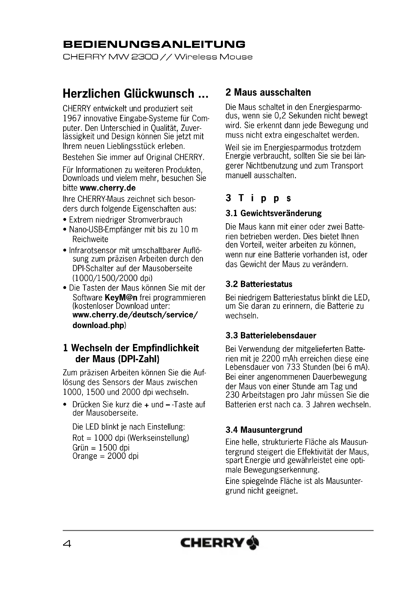 Geschäftsfeld Electronic Sys- tems, Auerbach/Opf., Deutsch- land, dass sich dieses Peripheriegerät mit Funkfunktion in Übereinstimmung mit den grundlegenden Anforderungen und den übrigen einschlägigen Bestimmungen der Richtlinie 1999/5/EG befindet. Die CE- Erklärung zur Konformität finden Sie unter folgender Internet-Adresse: http://www.cherry.de/compliance Klicken Sie dort auf den Produktnamen, um die CE-Erklärung zur Konformität zu öffnen.8 Congratulations ... CHERRY has developed and produced inno- vative input systems for computers since 1967. You can now experience the differ- ence in quality, reliability and design with your new favorite accessory. Always insist on original CHERRY products. For information on other products, down- loads and much more, visit us at www.cherry.de Your CHERRY mouse stands out especially due to the following features: