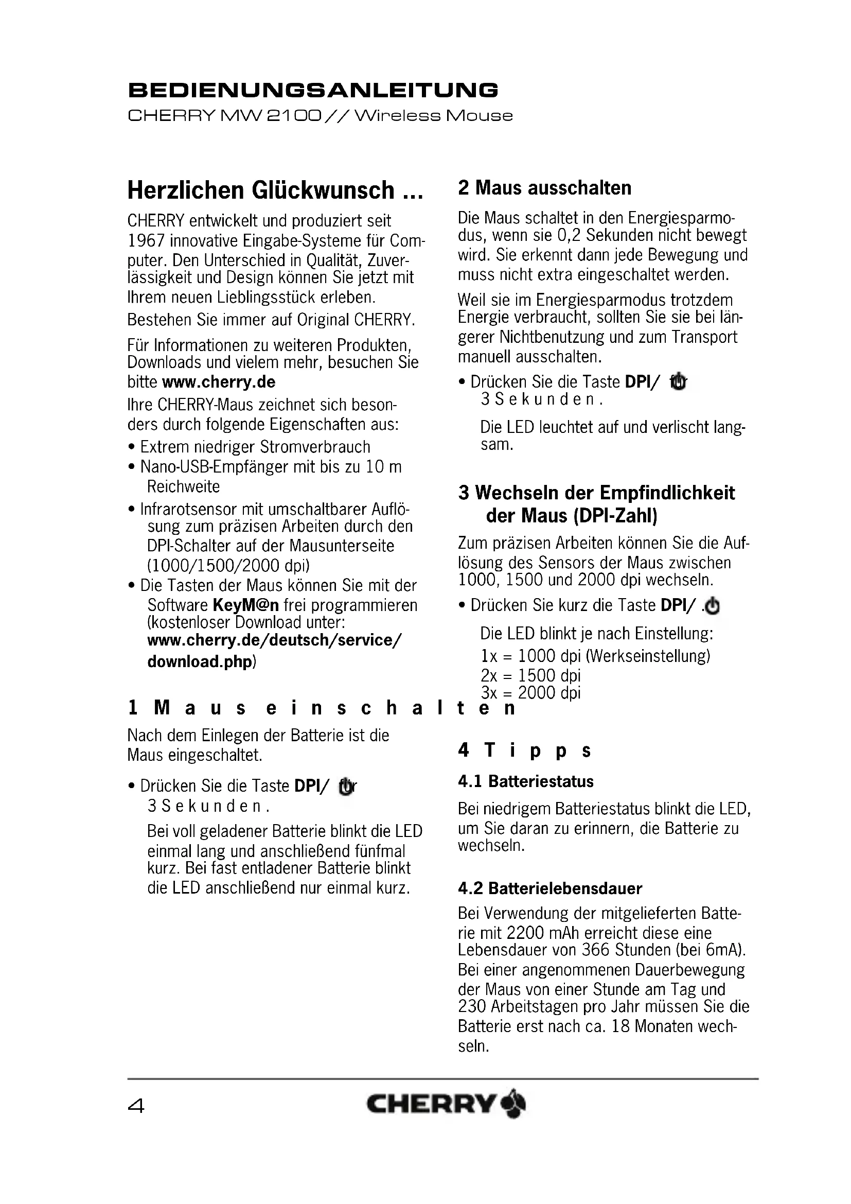 Geschäftsfeld Electronic Sys- tems, Auerbach/Opf., Deutsch- land, dass sich dieses Peripheriegerät mit Funkfunktion in Übereinstimmung mit den grundlegenden Anforderungen und den übrigen einschlägigen Bestimmungen der Richtlinie 1999/5/EG befindet. Die CE- Erklärung zur Konformität finden Sie unter folgender Internet-Adresse: http://www.cherry.de/compliance Klicken Sie dort auf den Produktnamen, um die CE-Erklärung zur Konformität zu öffnen.8 Congratulations ... CHERRY has developed and produced inno- vative input systems for computers since 1967. You can now experience the differ- ence in quality, reliability and design with your new favorite accessory. Always insist on original CHERRY products. For information on other products, down- loads and much more, visit us at www.cherry.de Your CHERRY mouse stands out especially due to the following features:
