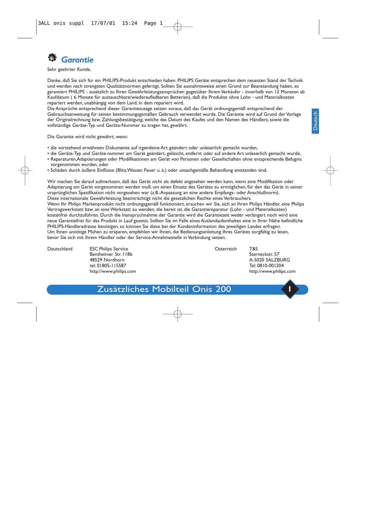 - Move the HANDSET slightly. - Clean the contacts with a cloth moistened with alcohol. Additional Onis 200 handset 3ALL onis suppl 17/07/01 15:24 Page 1 Garantie Danke, daß Sie sich für ein PHILIPS-Produkt entschieden haben. PHILIPS Geräte entsprechen dem neuesten Stand der Technik und werden nach strengsten Qualitätsnormen gefertigt. Sollten Sie ausnahmsweise einen Grund zur Beanstandung haben, so garantiert PHILIPS - zusätzlich zu Ihren Gewährleistungsansprüchen gegenüber Ihrem Verkäufer - innerhalb von 12 Monaten ab Kaufdatum ( 6 Monate für austauschbare/wiederaufladbaren Batterien), daß die Produkte ohne Lohn - und Materialkosten repariert werden, unabhängig von dem Land, in dem repariert wird. Die Ansprüche entsprechend dieser Garantiezusage setzen voraus, daß das Gerät ordnungsgemäß entsprechend der Gebrauchsanweisung für seinen bestimmungsgemäßen Gebrauch verwendet wurde. Die Garantie wird auf Grund der Vorlage der Originalrechnung bzw. Zahlungsbestätigung, welche das Datum des Kaufes und den Namen des Händlers, sowie die vollständige Geräte-Typ und Geräte-Nummer zu tragen hat, gewährt. Die Garantie wird nicht gewährt, wenn: