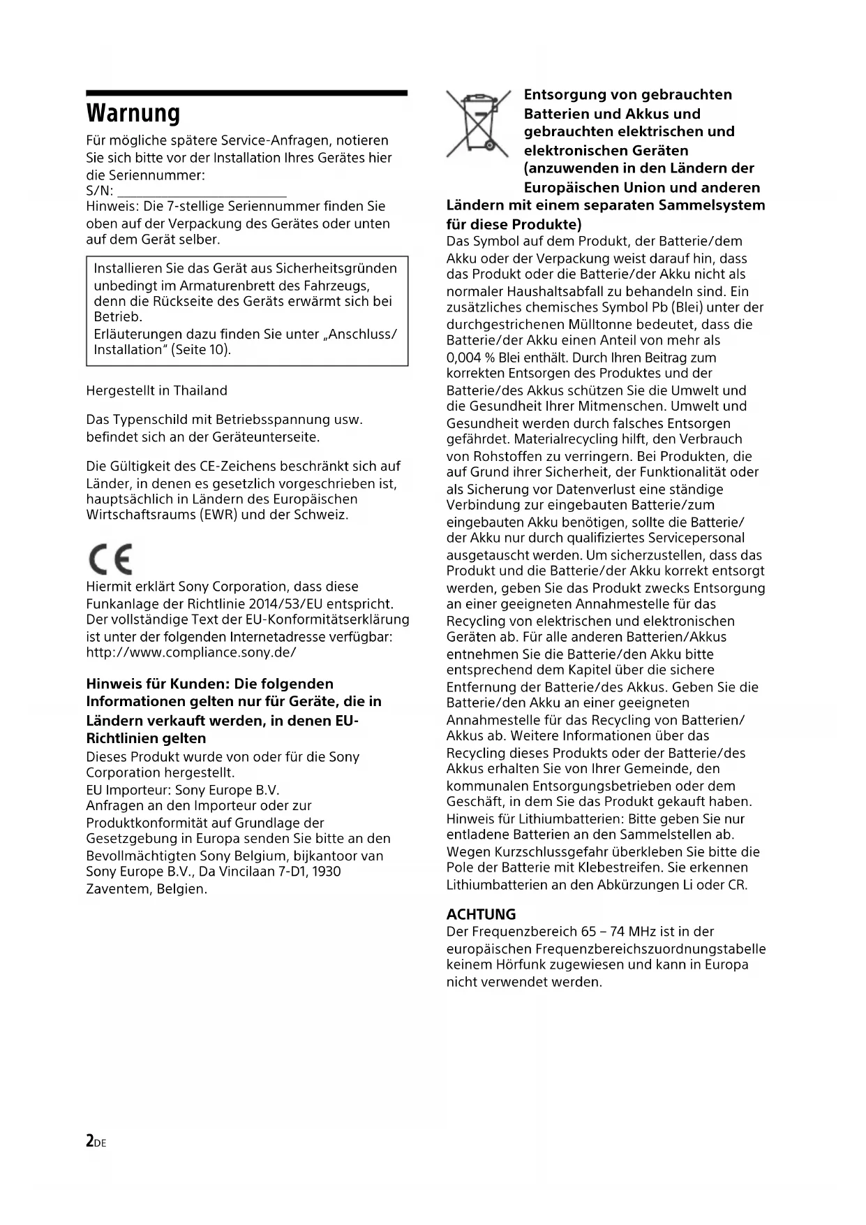 Vers tableau de bord/console centralePièces fournies avec votre véhicule SupportSupport Fusible (10 A)2DE Warnung Für mögliche spätere Service-Anfragen, notieren Sie sich bitte vor der Installation Ihres Gerätes hier die Seriennummer: S/N: ___________________________ Hinweis: Die 7-stellige Seriennummer finden Sie oben auf der Verpackung des Gerätes oder unten auf dem Gerät selber. Hergestellt in Thailand Das Typenschild mit Betriebsspannung usw. befindet sich an der Geräteunterseite. Die Gültigkeit des CE-Zeichens beschränkt sich auf Länder, in denen es gesetzlich vorgeschrieben ist, hauptsächlich in Ländern des Europäischen Wirtschaftsraums (EWR) und der Schweiz. Hiermit erklärt Sony Corporation, dass diese Funkanlage der Richtlinie 2014/53/EU entspricht. Der vollständige Text der EU-Konformitätserklärung ist unter der folgenden Internetadresse verfügbar: http://www.compliance.sony.de/ Hinweis für Kunden: Die folgenden Informationen gelten nur für Geräte, die in Ländern verkauft werden, in denen EU- Richtlinien gelten Dieses Produkt wurde von oder für die Sony Corporation hergestellt. EU Importeur: Sony Europe B.V. Anfragen an den Importeur oder zur Produktkonformität auf Grundlage der Gesetzgebung in Europa senden Sie bitte an den Bevollmächtigten Sony Belgium, bijkantoor van Sony Europe B.V., Da Vincilaan 7-D1, 1930 Zaventem, Belgien. Entsorgung von gebrauchten Batterien und Akkus und gebrauchten elektrischen und elektronischen Geräten (anzuwenden in den Ländern der Europäischen Union und anderen Ländern mit einem separaten Sammelsystem für diese Produkte) Das Symbol auf dem Produkt, der Batterie/dem Akku oder der Verpackung weist darauf hin, dass das Produkt oder die Batterie/der Akku nicht als normaler Haushaltsabfall zu behandeln sind. Ein zusätzliches chemisches Symbol Pb (Blei) unter der durchgestrichenen Mülltonne bedeutet, dass die Batterie/der Akku einen Anteil von mehr als 0,004 % Blei enthält. Durch Ihren Beitrag zum korrekten Entsorgen des Produktes und der Batterie/des Akkus schützen Sie die Umwelt und die Gesundheit Ihrer Mitmenschen. Umwelt und Gesundheit werden durch falsches Entsorgen gefährdet. Materialrecycling hilft, den Verbrauch von Rohstoffen zu verringern. Bei Produkten, die auf Grund ihrer Sicherheit, der Funktionalität oder als Sicherung vor Datenverlust eine ständige Verbindung zur eingebauten Batterie/zum eingebauten Akku benötigen, sollte die Batterie/ der Akku nur durch qualifiziertes Servicepersonal ausgetauscht werden. Um sicherzustellen, dass das Produkt und die Batterie/der Akku korrekt entsorgt werden, geben Sie das Produkt zwecks Entsorgung an einer geeigneten Annahmestelle für das Recycling von elektrischen und elektronischen Geräten ab. Für alle anderen Batterien/Akkus entnehmen Sie die Batterie/den Akku bitte entsprechend dem Kapitel über die sichere Entfernung der Batterie/des Akkus. Geben Sie die Batterie/den Akku an einer geeigneten Annahmestelle für das Recycling von Batterien/ Akkus ab. Weitere Informationen über das Recycling dieses Produkts oder der Batterie/des Akkus erhalten Sie von Ihrer Gemeinde, den kommunalen Entsorgungsbetrieben oder dem Geschäft, in dem Sie das Produkt gekauft haben. Hinweis für Lithiumbatterien: Bitte geben Sie nur entladene Batterien an den Sammelstellen ab. Wegen Kurzschlussgefahr überkleben Sie bitte die Pole der Batterie mit Klebestreifen. Sie erkennen Lithiumbatterien an den Abkürzungen Li oder CR. ACHTUNG Der Frequenzbereich 65 – 74 MHz ist in der europäischen Frequenzbereichszuordnungstabelle keinem Hörfunk zugewiesen und kann in Europa nicht verwendet werden. Installieren Sie das Gerät aus Sicherheitsgründen unbedingt im Armaturenbrett des Fahrzeugs, denn die Rückseite des Geräts erwärmt sich bei Betrieb. Erläuterungen dazu finden Sie unter „Anschluss/ Installation“ (Seite 10).3DE Haftungsausschluss für von Dritten angebotene Dienste Von Dritten angebotene Dienste können ohne vorherige Ankündigung geändert, ausgesetzt oder eingestellt werden. Sony übernimmt in diesen Fällen keine Haftung. Vorsicht UNTER KEINEN UMSTÄNDEN ÜBERNIMMT SONY DIE HAFTUNG FÜR INDIREKTE, NEBEN-, FOLGE- ODER